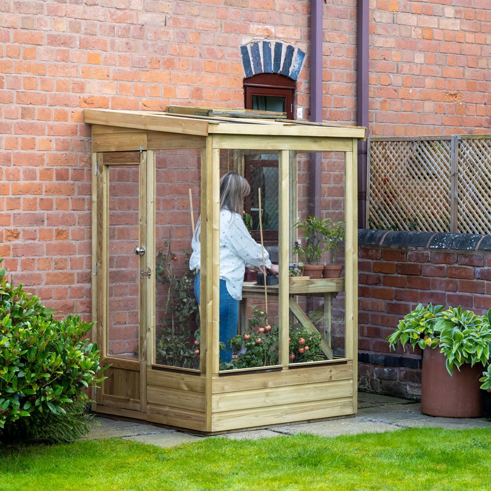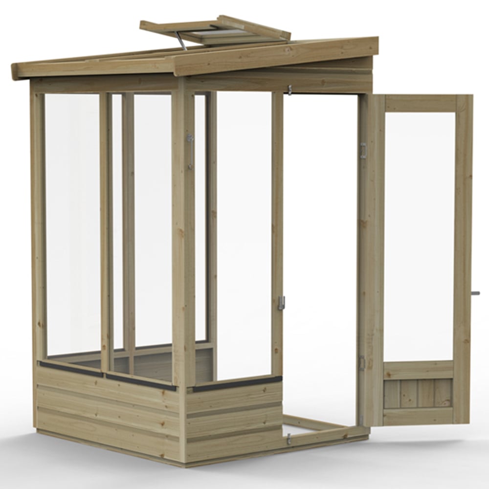 The Forest Wallscape 4x4 Lean-To Greenhouse with an open back is perfect for smaller or urban gardens or patios, offering an ideal space to grow a variety of plants and flowers all year-round. This beautiful lean-to greenhouse has a convenient opening roof window allowing you to adjust the internal temperature to meet the needs of all your plants. The pent roof means that there will not be any water accumulated on top of your structure. The single door can be installed on either gable end, allowing you to position it according to your preferred layout. The Forest Wallscape 4x4 Lean-to Greenhouse is made in Great Britain and is constructed using premium horizontal interlocking 12mm shiplap tongue and groove cladding. Reinforced by thick wooden framing to support the cladding from within, this structure provides a durable and sturdy building that will last for years. The glazing is made from UV resistant acrylic, which allows maximum light into the greenhouse while being safe and shatterproof. No floor is supplied with the greenhouse to ensure water can drain easily after you have watered any produce or plants you are growing inside. The timber used to build this greenhouse is FSC®-certified pressure treated wood and comes with a 15 year guarantee against rot and fungal decay, which is essential when the timber is in constant contact with the damp. Please Note: Orders to the following postal codes may be subject to longer leads than advertised: