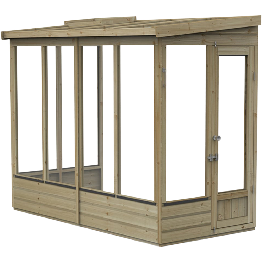 The Forest Wallscape 4x8 Lean-To Greenhouse with an open back is perfect for smaller or urban gardens or patios, offering an ideal space to grow a variety of plants and flowers all year-round. This beautiful lean-to greenhouse has a convenient opening roof window allowing you to adjust the internal temperature to meet the needs of all your plants. The pent roof means that there will not be any water accumulated on top of your structure. The single door can be installed on either gable end, allowing you to position it according to your preferred layout. The Forest Wallscape 4x8 Lean-to Greenhouse is made in Great Britain and is constructed using premium horizontal interlocking 12mm shiplap tongue and groove cladding. Reinforced by thick wooden framing to support the cladding from within, this structure provides a durable and sturdy building that will last for years. The glazing is made from UV resistant acrylic, which allows maximum light into the greenhouse while being safe and shatterproof. No floor is supplied with the greenhouse to ensure water can drain easily after you have watered any produce or plants you are growing inside. The timber used to build this greenhouse is FSC®-certified pressure treated wood and comes with a 15 year guarantee against rot and fungal decay, which is essential when the timber is in constant contact with the damp. Please Note: Orders to the following postal codes may be subject to longer leads than advertised: