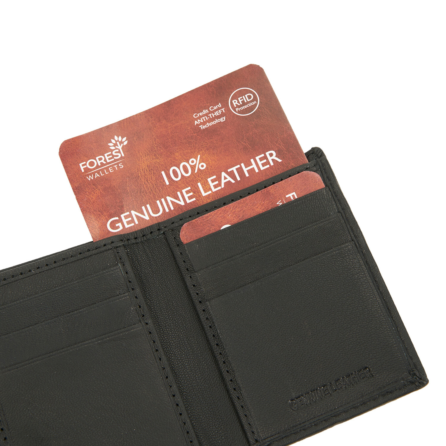 Introducing the Forest Leather Wallet, a sophisticated and refined accessory for the modern gentleman. This sleek black leather wallet not only exudes style but also offers RFID-blocking technology to keep your information secure. With seven card holder slots, two spacious double note pockets, and a convenient popper pouch coin pocket, this wallet is designed to meet all your daily needs while keeping your essentials organised.