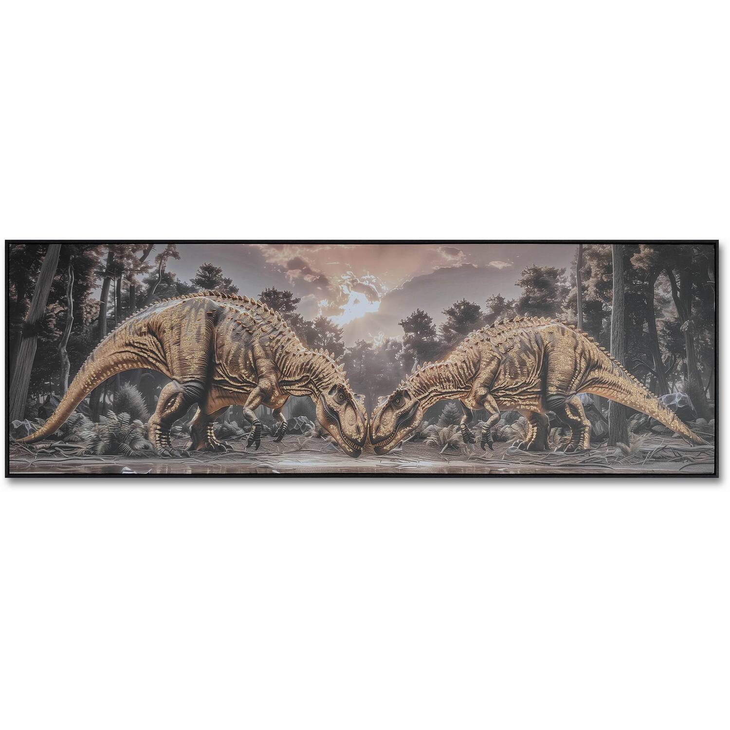 Bring the prehistoric era to life in your very own space with this Framed Jurassic Art. Featuring two scary dinosaurs locked in a battle with each other, this piece will give your space a cutting-edge personality and is sure to stand out wherever it's placed. Ideal for hallways and living rooms, this art piece is sure to delight all visitors. Easy to hang, it comes with hooks for convenient hanging.