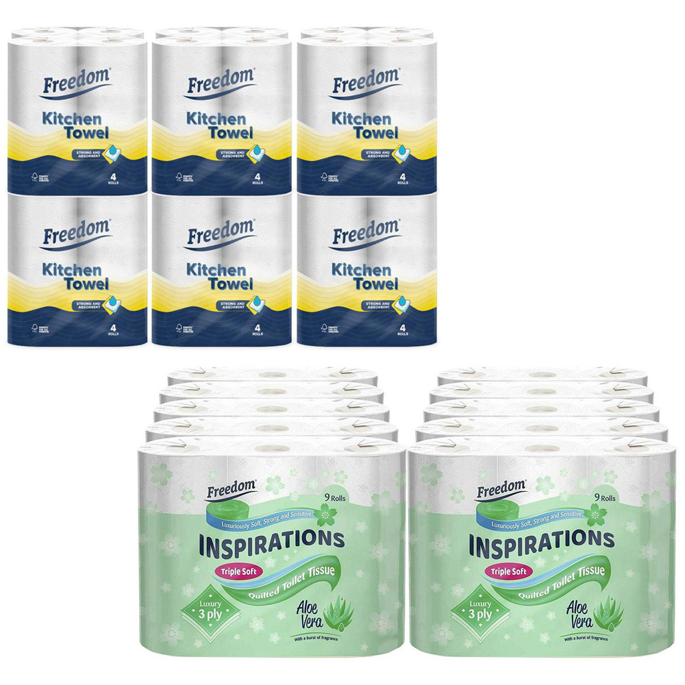 The Freedom Aloe Vera Toilet Paper 3 Ply 90 Rolls with Kitchen Towel 24 Rolls 2 Ply bundle offers a perfect combination of cleanliness, comfort, and convenience for everyday use. The Freedom Inspirations Quilted Aloe Vera Toilet Paper features three layers of quilted softness, providing a balance of comfort and strength, and is hypoallergenic, making it safe for sensitive skin. Each roll contains 160 sheets, and the pack includes 135 rolls (15 packs of 9 rolls), ensuring you and your family feel fresh and clean with a subtle, soothing aloe vera scent. Made in the UK with sustainably sourced virgin pulp, these toilet rolls are designed with micro-impressions for a luxurious, ultra-soft touch. The Rhino Super Strong & Absorbent Multipurpose Kitchen Paper Roll comes with 24 rolls, packed conveniently in sets of four for easy storage. These 2-ply kitchen rolls utilize unique Liqui-Sorb technology for super absorbency, making them ideal for tackling large spills, grime, oil, and everyday messes. With 50 sheets per roll, they offer great value and performance for a wide variety of domestic and commercial tasks. This bundle includes 135 rolls of Freedom Inspirations Quilted Aloe Vera 3 Ply Toilet Paper and 24 rolls of Rhino Kitchen Tissue Paper, ensuring you have everything you need for a clean and comfortable home.