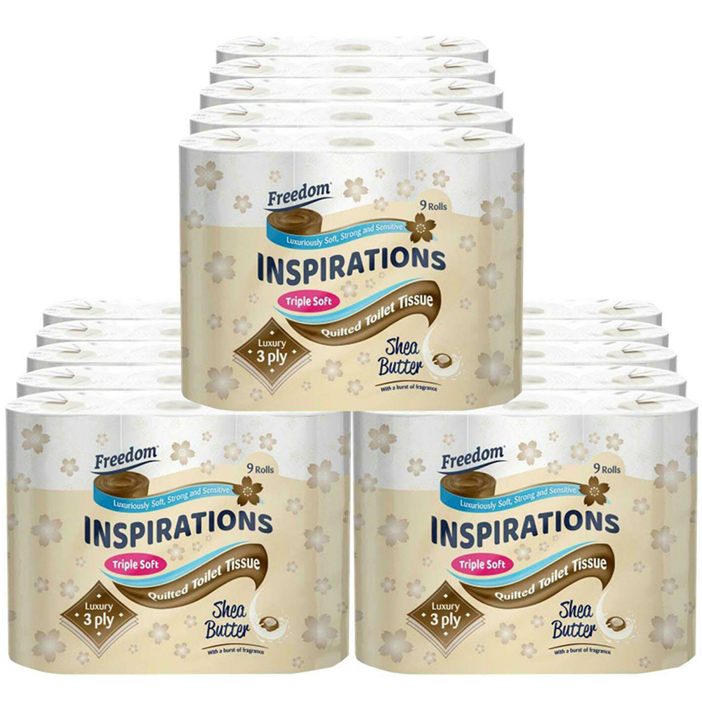 This Freedom Inspirations Quilted Shea Butter Toilet Paper 135 Rolls 3 Ply is designed to be used anytime where cleanliness and comfort are a priority. It is often the simple things that make life a whole lot easier. In our everyday lives, comfort and ease combined with responsible choices can make a big difference to our quality of life. It has the balance of softness and strength to leave you and your family feeling fresh and clean. It possesses a luxurious quilted surface to give that feeling of softness and luxury. Featuring deco-embossed design on a white pure pulp paper, these toilet tissues come in 5 pack of 9 rolls, in total 45 rolls (160 sheets per roll). Created with micro-impressions, Quilted, and ultra soft-to-touch yet absorbent and strong, with a touch of scented goodness, for softness your skin deserves. Made in the UK with sustainably sourced virgin pulp. Each toilet roll, like all Freedom tissue paper, is sustainably sourced. Each roll releases a pleasing luxurious aroma helping to calm, soothe and detoxify for a sense of added cleanliness and luxury. 45 Rolls (5 Packs of 9 Rolls). Toilet Paper Ply : 3 Ply. Sheets Per Roll : 160. Package Includes : 45 Rolls Freedom Quilted Shea Butter 3 Ply Toilet Paper.