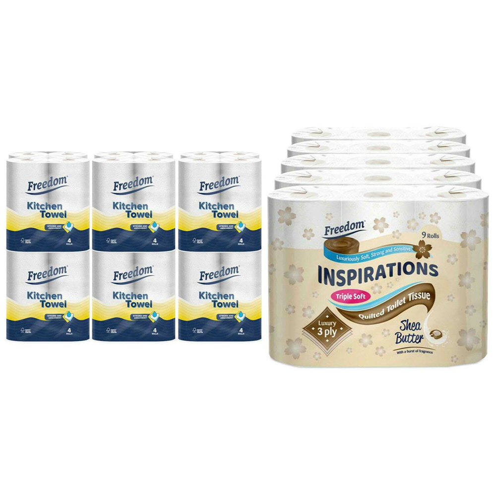 This Freedom White Toilet Paper 3 Ply with Kitchen Towel 24 Rolls 2 Ply offers a perfect blend of cleanliness and comfort for everyday use. The toilet paper features three layers of quilted softness, providing a balance of comfort and durability, and is hypoallergenic, making it safe for sensitive skin. It includes 45 rolls (5 packs of 9 rolls), each with 160 sheets, and flushable wipes for an ultimate clean and fresh feeling. The Rhino kitchen towels are super absorbent with 2-ply Liqui-Sorb technology, ideal for large spills, grime, oil, and everyday messes. Conveniently packed in sets of four, the 24 rolls are easy to store and are food contact safe, making them perfect for various kitchen tasks. This bundle ensures you and your family enjoy a higher quality of life with essential household products.