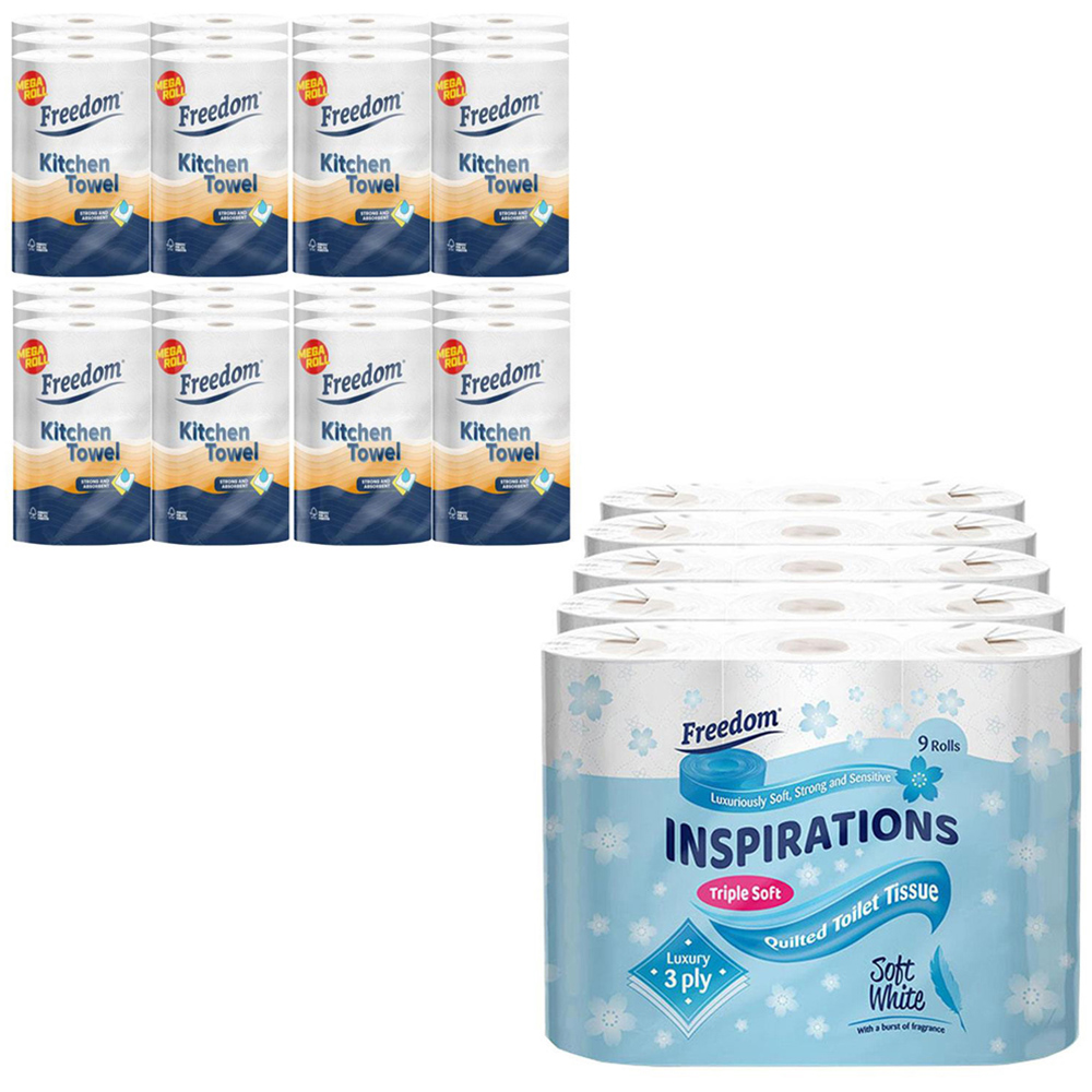 The Freedom White Toilet Paper Roll 3 Ply with Rhino Jumbo Kitchen Towel 4 Pack bundle offers a perfect combination of cleanliness, comfort, and convenience for everyday use. The Freedom Inspirations Quilted Soft White Toilet Paper features three layers of quilted softness, providing a balance of comfort and strength, and is hypoallergenic, making it safe for sensitive skin. Each roll contains 160 sheets, and the pack includes 45 rolls (5 packs of 9 rolls), ensuring you and your family feel fresh and clean. The Rhino Jumbo Luxury Kitchen Towel Rolls are super absorbent, utilizing unique Liqui-Sorb technology, making them ideal for tackling large spills, grime, oil, and everyday messes. These 2-ply kitchen rolls are food contact safe and come with 200 sheets per roll, offering great value and performance for a wide variety of domestic and commercial tasks. This bundle includes 45 rolls of Freedom Inspirations Quilted Soft White 3 Ply Toilet Paper and 24 rolls of Freedom Jumbo Kitchen Towel Rolls, ensuring you have everything you need for a clean and comfortable home.