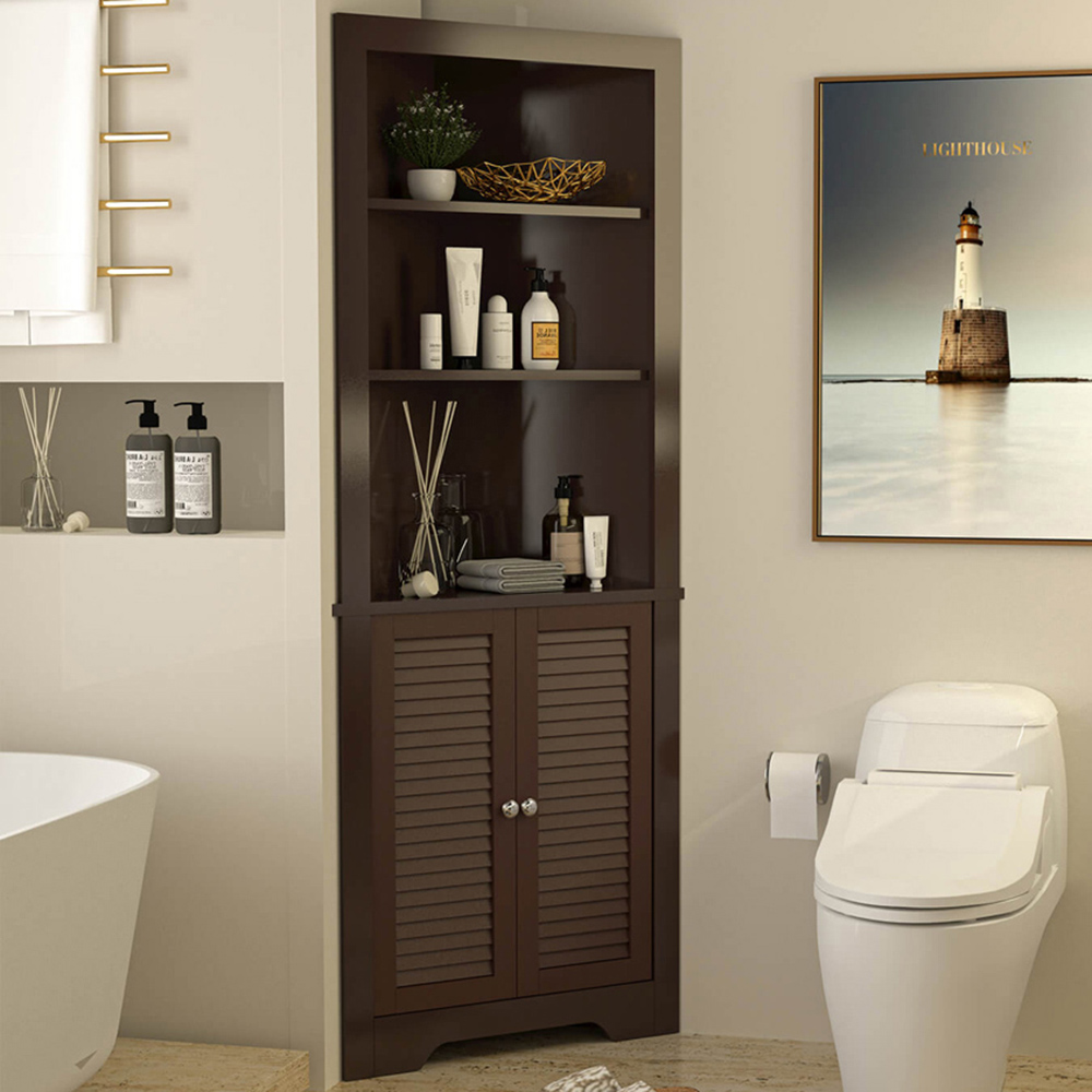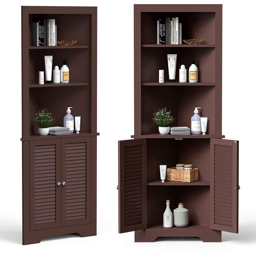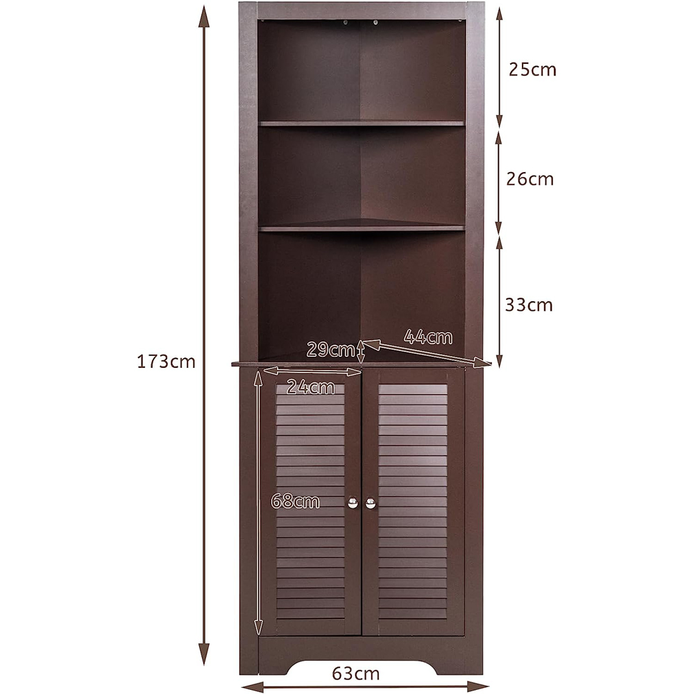 Say goodbye to clutter with the Costway 2 Door 3 Shelf Coffee Bathroom Corner Cabinet. Crafted from a premium P2 MDF board, this cabinet offers stability and durability for long-lasting use. Constructed from premium engineered wood, this cabinet ensures stability and durability for long-term use. It features three open shelves and a closed cabinet with an adjustable interior shelf, providing ample storage for towels, shower essentials, books, and more. The classic brown finish and unique design make it a versatile addition to any decor style, from retro to contemporary. Its triangular shape is designed to maximize space utilisation, fitting seamlessly into any corner without taking up excessive room. Assembly is a breeze with the included detailed instructions and hardware, and the smooth surface is easy to maintain, allowing for effortless cleanup with just a damp cloth.