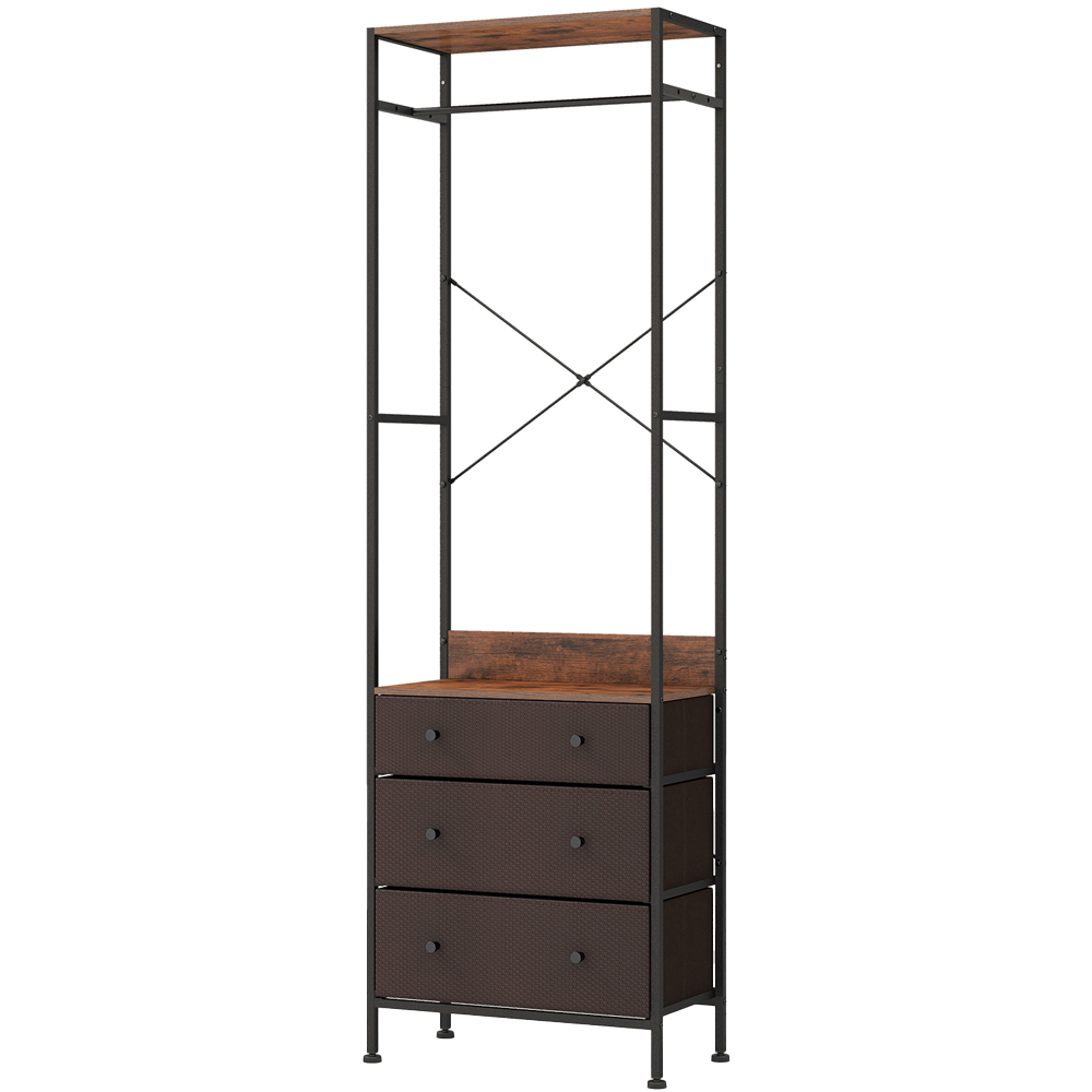 Effortlessly enhance your space and keep items neatly organised with the Costway 3 Drawer Single Shelf Rustic Brown Clothes Rack. This versatile piece not only offers ample storage with its top shelf, hanging rod, middle shelf, and three foldable drawers but also adapts to various needs thanks to its adjustable hanging rod positions and drawer with dividers. Designed with a heavy-duty metal frame and reinforced with X-shaped braces, it ensures stability and safety with anti-toppling devices and adjustable foot pads. The rustic brown finish and industrial design seamlessly blend with any home decor, making it perfect for hallways, bedrooms, or cloakrooms. Its easy assembly and space-saving stature make it an indispensable addition to any compact space.