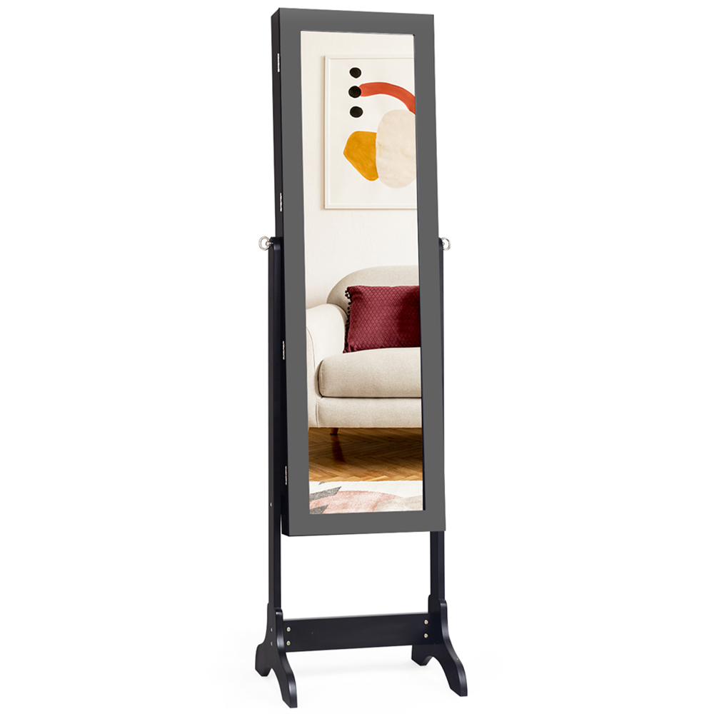 Say goodbye to cluttered dresser tops and lost earrings with the Costway Black Freestanding Mirror Jewellery Cabinet. This sleek black cabinet not only offers ample storage to neatly organize all your jewellery but also features an adjustable full-length mirror. With its elegant and modern design, it becomes a stunning addition to any room, providing both functionality and style. Its lockable door ensures your treasures are kept safe and dust-free, while the soft flannel lining protects them from scratches, making this cabinet an ideal solution for any jewellery enthusiast.