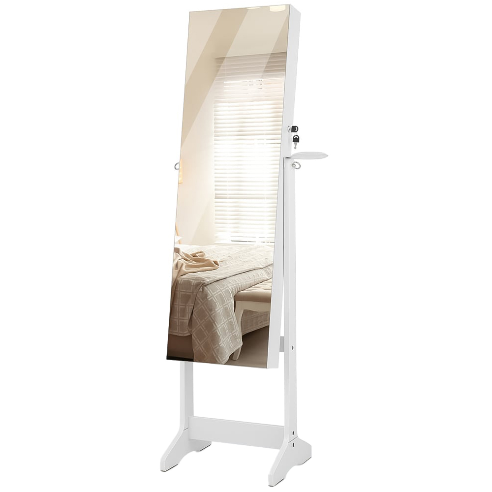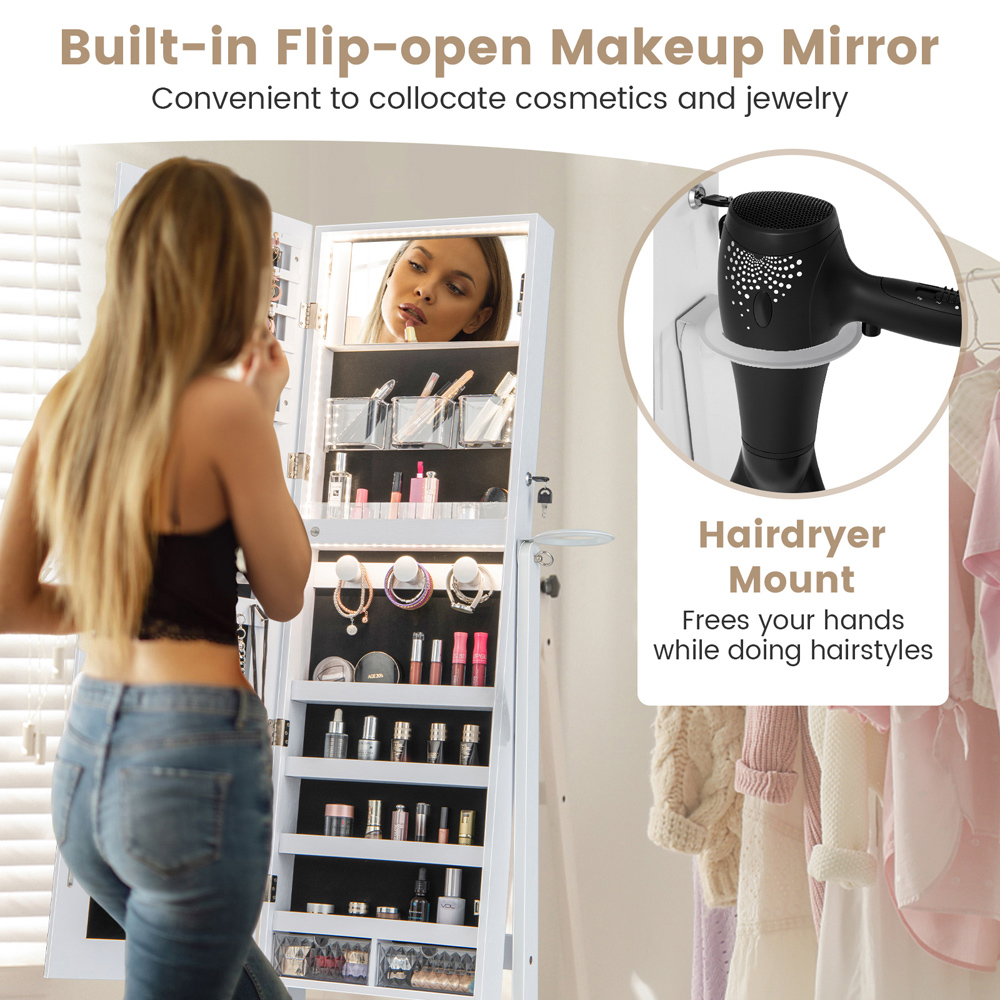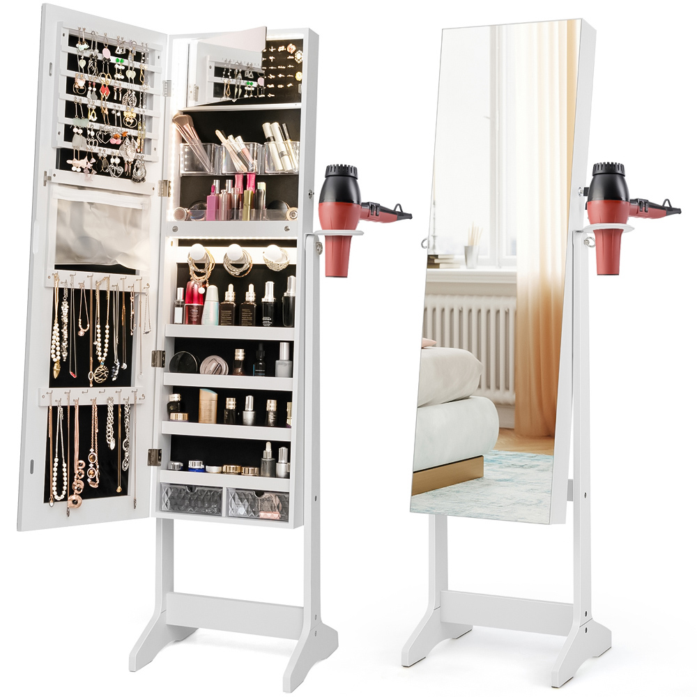 Elevate your dressing routine with the Costway White Freestanding LED Mirror Jewellery Cabinet. This chic white cabinet is not just a storage unit but a dressing companion with a full-length mirror and an additional built-in mirror, perfect for outfit checks and makeup application. Featuring auto-on LED lights with three adjustable colour temperatures, it caters to various lighting needs for different makeup looks. The cabinet also boasts a hairdryer mount for added convenience during your grooming sessions, ensuring everything you need is within reach for a seamless dressing experience. It also features 108 earring slots, 36 holes, 24 hooks, and 78 ring slots.