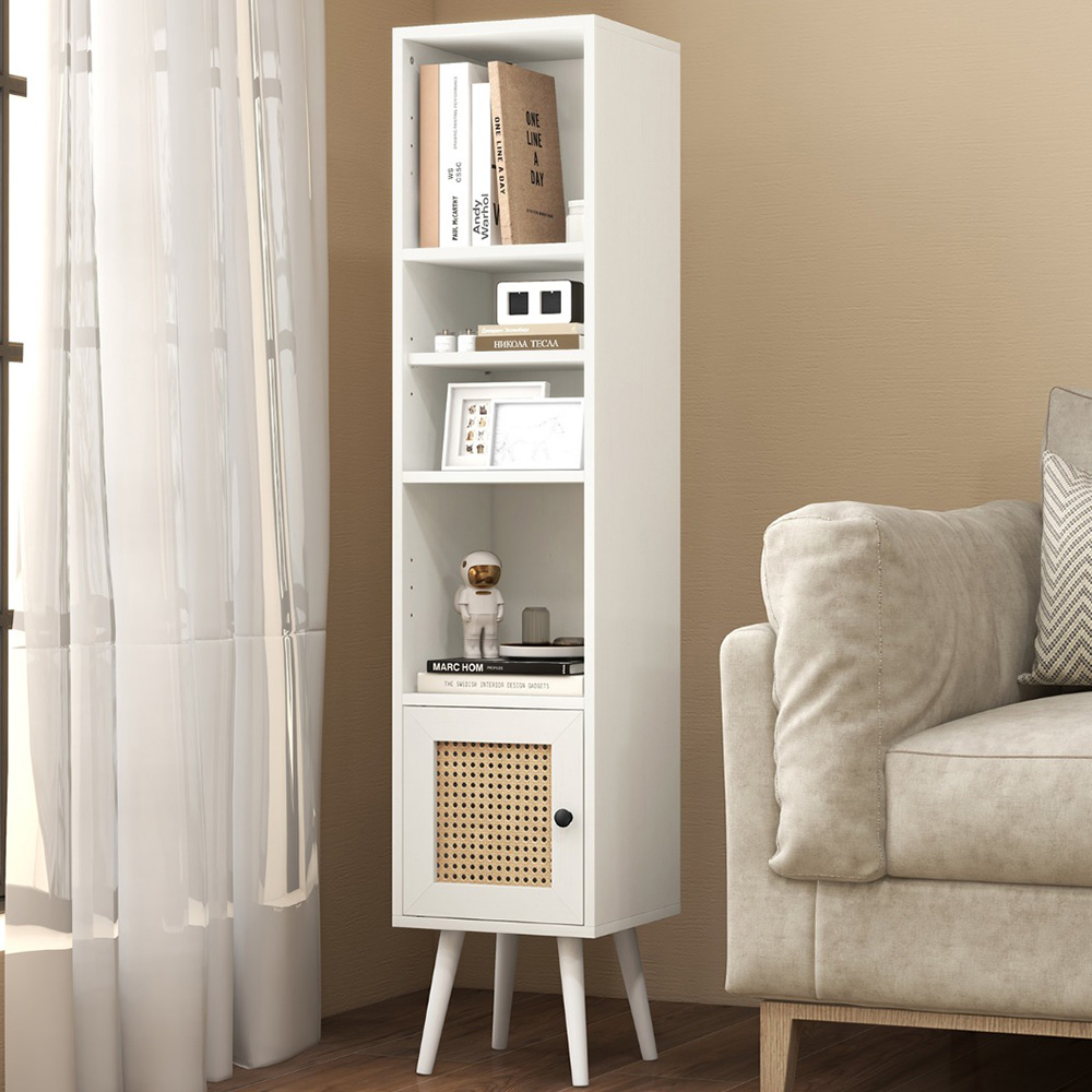Enhance any room with the Costway Single Door 4 Shelf White Slim Wooden Cabinet, a stylish and practical piece that fits perfectly in corners or small spaces to maximize your storage. Its sleek finish complements the Boho-inspired rattan woven door and solid wood legs, creating a vacation-like vibe that elevates your decor. With features like three open cubbies, an adjustable shelf with twelve positions, and a magnetic door catch for ease of use, this cabinet not only reduces clutter but also adds a contemporary flair to your living space. Safety is prioritised with two anti-tipping kits, ensuring stability and peace of mind.