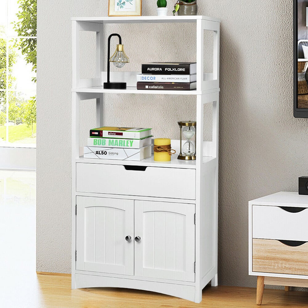 Maximize your storage options with this Costway 2 Door Single Drawer 2 Shelf White Freestanding Wooden Cabinet, perfect for keeping your home organized and tidy. Crafted from premium MDF, this white cabinet offers a blend of two open shelves, one drawer, and one cupboard, ensuring you have plenty of space to store various items. Its freestanding design allows easy placement in any room, from bathrooms to kitchens, while the option to secure it to the wall adds an extra layer of safety. Complete with simple metal doorknobs and a water-resistant coating, this cabinet is not only functional but also easy to maintain.
