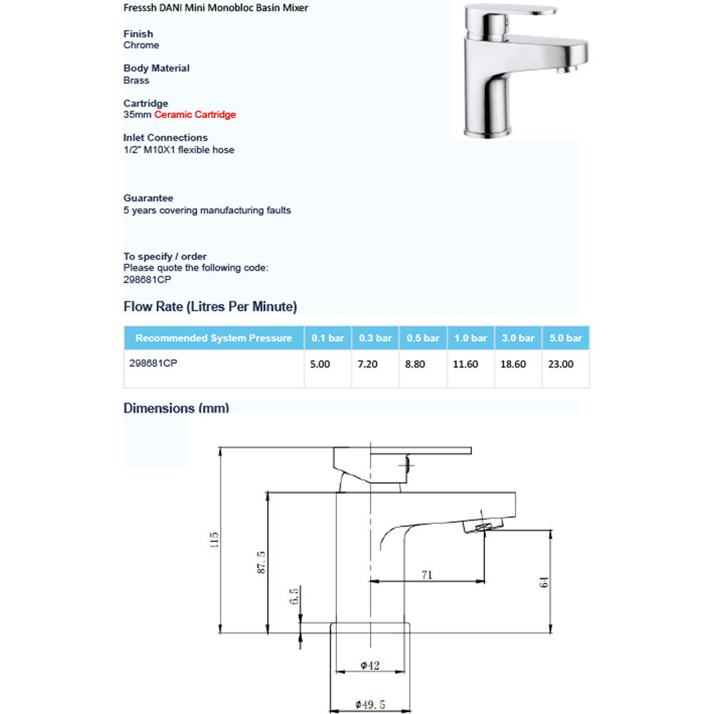 The Fresssh Dani Mini Mono Basin Mixer with Clicker Waste in chrome is a compact and stylish tap specifically designed for smaller basins or cloakrooms where space is limited. This monobloc mixer features a single lever for easy control of water flow and temperature, and it comes with a clicker waste for convenient draining. The sleek, minimalist design and chrome finish complement various bathroom styles.