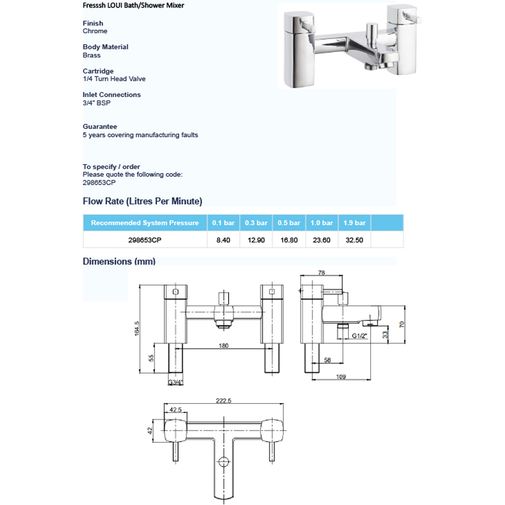 The Fresssh Loui Bath Shower Mixer + Kit in chrome is a stylish and versatile addition to any modern bathroom. This bath shower mixer combines a sleek, contemporary design with practical functionality, allowing you to easily switch between a relaxing bath fill and an invigorating shower.
