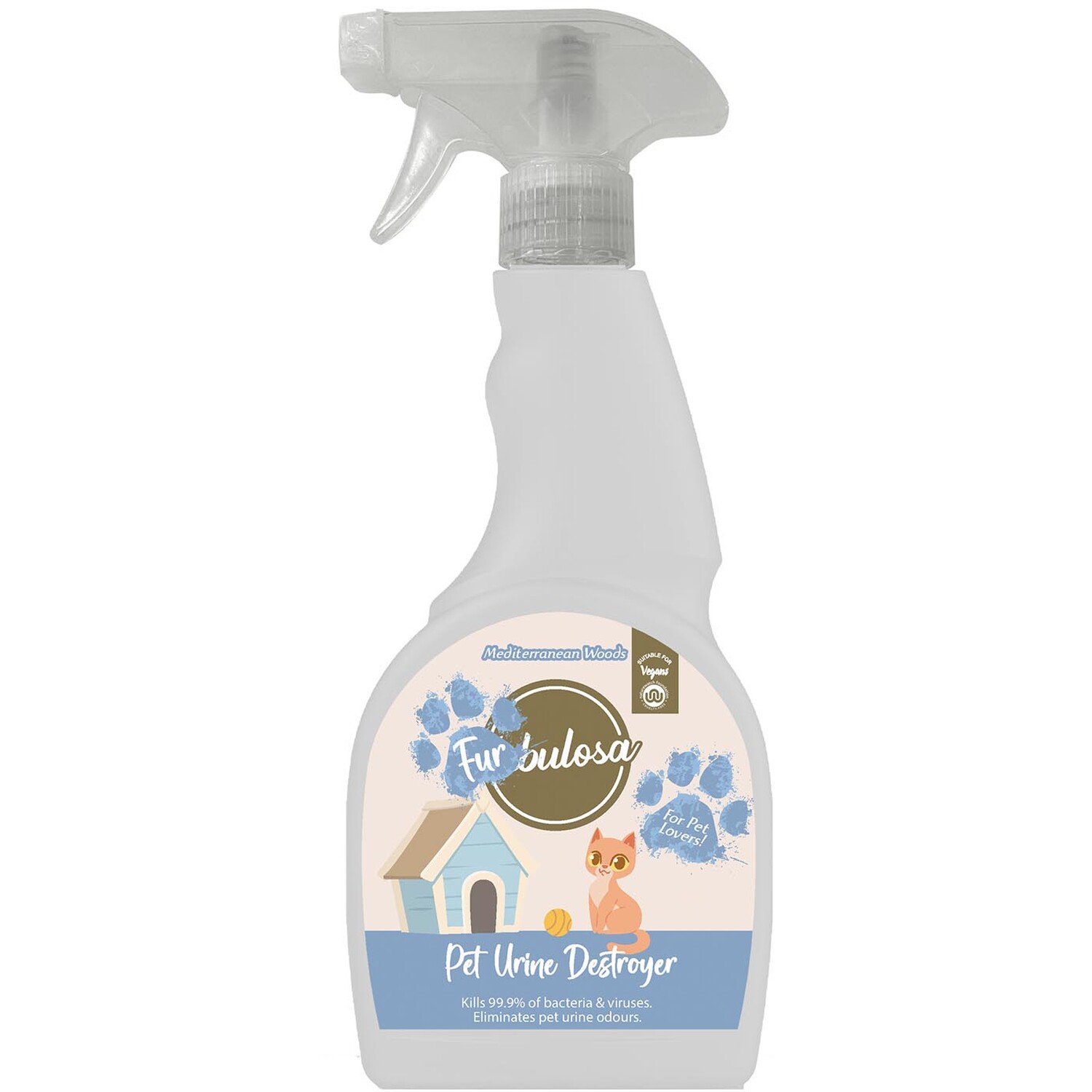 Eliminate pet urine odours from your home with the Furbulosa Pet Urine Destroyer 500ml. Got a cat that won't stop spraying? Or a new puppy that's not been trained yet? This Pet urine destroyer kills bacteria and leaves behind a delightful Mediterranean Woods fragrance.