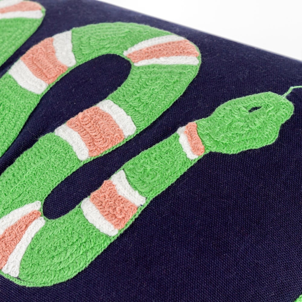 Add a tropical feel to your living space with the furn Coral Snake Embroidered Cushion. The cushion is made from super soft 100% cotton fabric. It features a detailed embroidered snake on a soft velvet background and a contrasting bright green border. Enliven your living space by adding character to your sofa with this cushion.