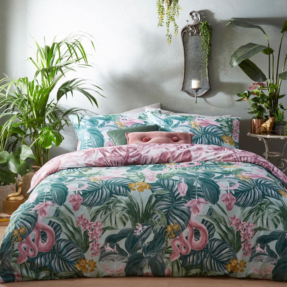 Lose yourself in the lush tropical paradise with this stunning furn. Medinilla Single Mint and Lilac Tropical Duvet Cover Set. Crafted from crisp polycotton, this set features intricate tropical foliage teeming with exotic creatures in their natural habitat, from the mesmerizing praying mantis to the graceful snake. The reversible design allows you to switch up your bedroom's look, perfect for balmy summer evenings. Plus, the clear button closure makes it easy to remove the duvet for cleaning. Comes with a pillowcase.