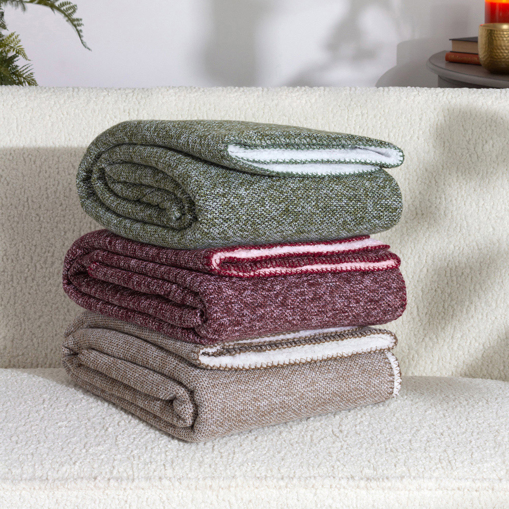 The Nurrel Moss Green Knitted Throw is a versatile addition to your home. Whether you use it on your sofa, in your car, for a picnic, or on your bed, this throw is a must-have. It is made with multiple yarns, creating a beautiful melange knit pattern. With its mottled melange knitted pattern and sherpa reverse, this throw is perfect for keeping you warm and cosy. Size: 130 x 180cm.