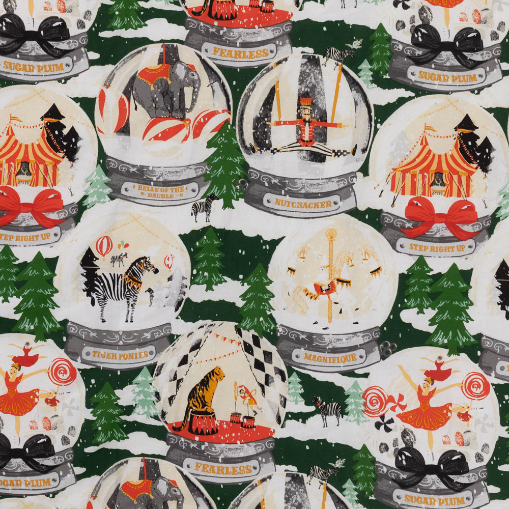Welcome the festive spirit into your home with the furn. Showtime King Size Pine Duvet Set. This charming collection features scenic snow globes inspired by the circus and festive fairgrounds, filled with festive characters and exotic animals. Perfect for themed Christmas bedrooms, this duvet cover set is complete with a harlequin diamond reverse for an alternative look.