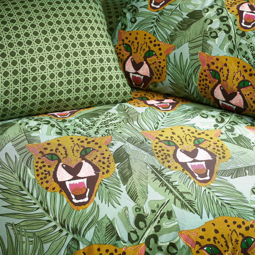 Make a statement with this furn. Untamed King Size Green Duvet Set. Made of crisp polycotton, this set features vibrant coral cheetahs pop on a background of blue tropics peppered with tonal leopard print. The reverse has a more paired back tonal ratan design, which can uplift your bedroom decor. With a clear button closure, this set can be an elegant and versatile option to add to your bedroom.