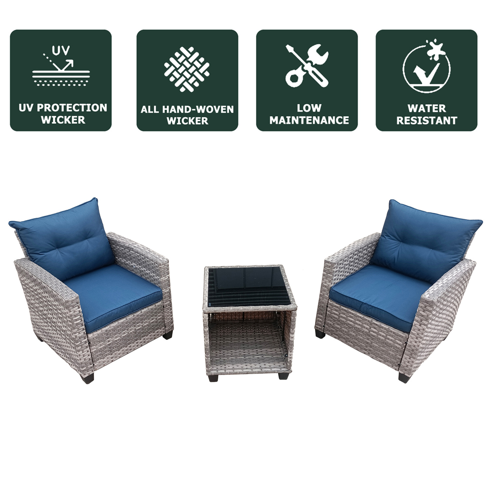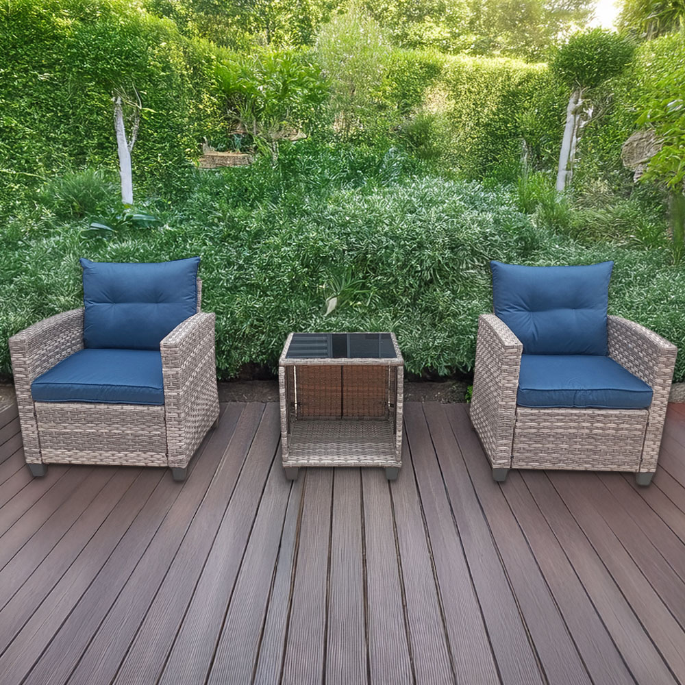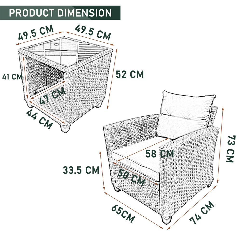 This set includes 2 single seats with cushions and a glass top table, ideal for small outdoor spaces like balconies, patios, or apartments. It's perfect for relaxing and chatting with friends. The high-density rebound sponge cushions provide a comfortable seating experience. They are removable, waterproof, and fireproof, catering to various needs and ensuring durability. Materials: Table: 5mm Tempered Glass. Frame: Powder Coated Metal Frame. Wrapped in PE Rattan. Dimensions: H52 x W49.5 x D49.5cm. Weight: 33.5kg.
