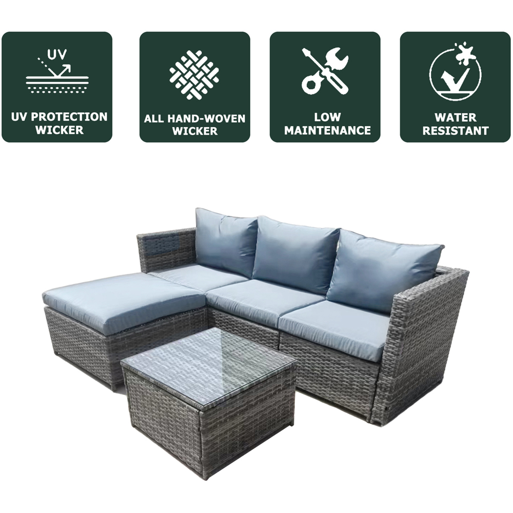 Transform your outdoor area into a haven of relaxation with the Reversible Rattan Corner Sofa Set, a perfect blend of style and functionality. Crafted from premium PE rattan, this weatherproof L-shaped sofa is built on a robust steel frame, ensuring durability across all seasons. The set includes a spacious right 2-seater, a cosy chaise lounge, and a sleek glass-top coffee table, making it ideal for gatherings or peaceful solo moments under the sun. The 5cm thick cushions provide exceptional comfort, and the 5mm tempered glass adds a contemporary, practical touch to your patio, balcony, or backyard.