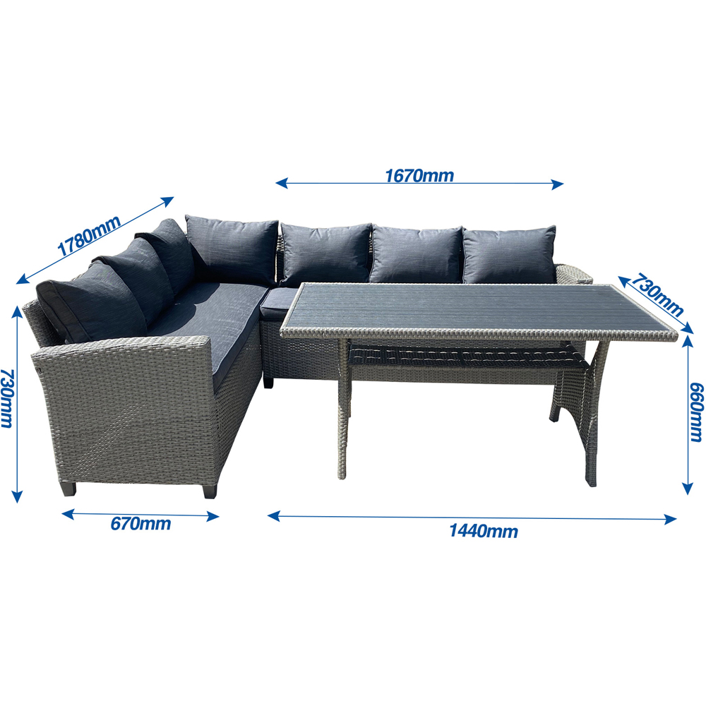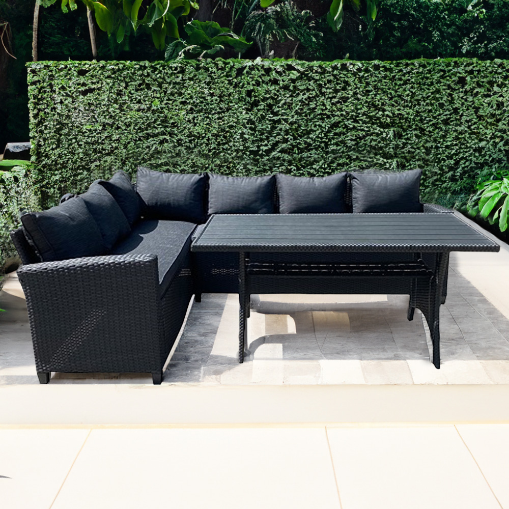This outdoor sectional backyard furniture has a steel frame and beautiful hand-woven PE rattan.  All-weather rattan is more UV and water-fighting than normal wicker, so it's perfect for outdoor dining. The thick padded seat and back cushions of the patio sectional furniture set offer maximum comfort for your lounging experience. The cushion cover is easy to clean with a water-repellent and stain-resistant polyester cover. The long rectangle rattan table with a matching bench of the outdoor sofa set creates a centrepiece for the sectional and a place for you to eat and drink with friends.