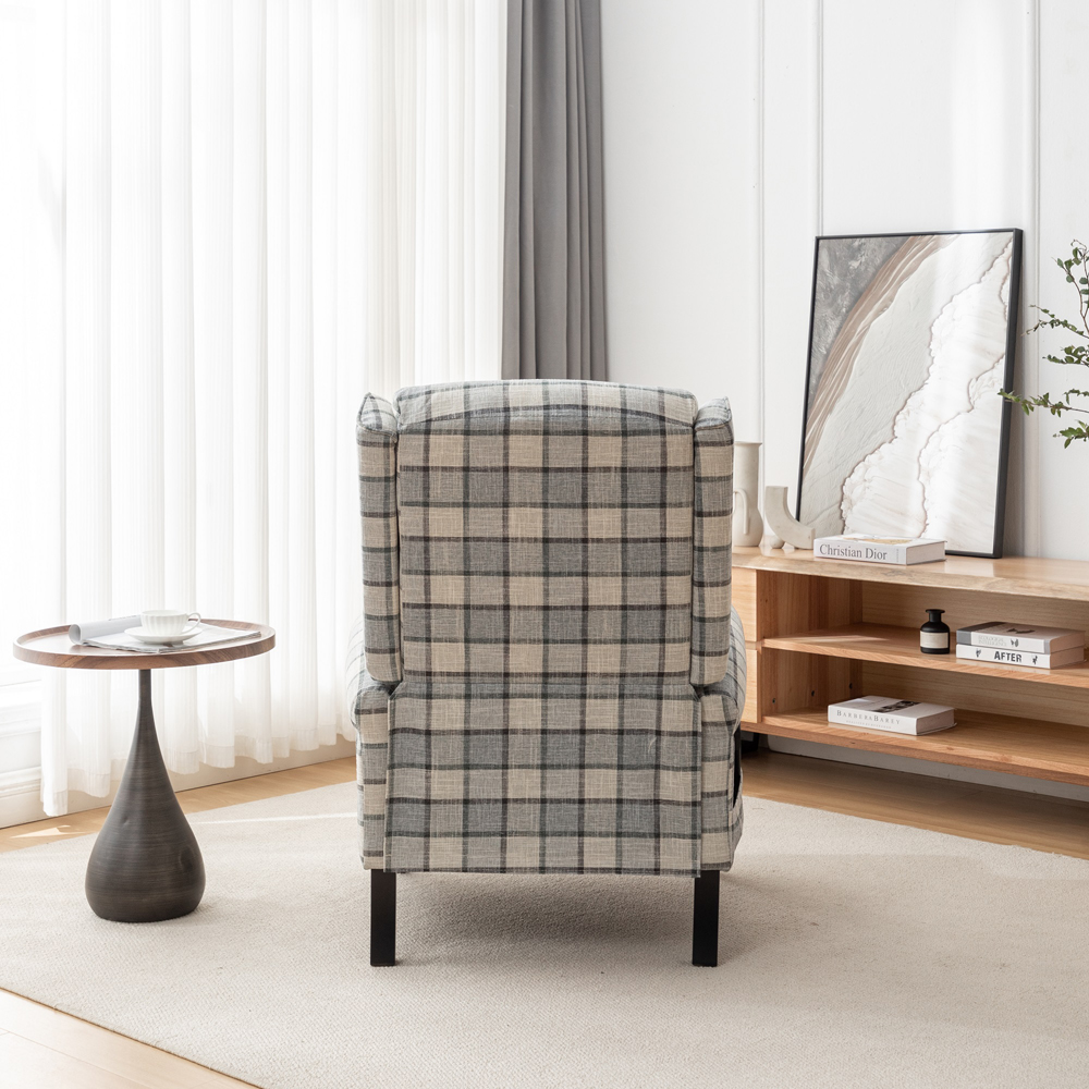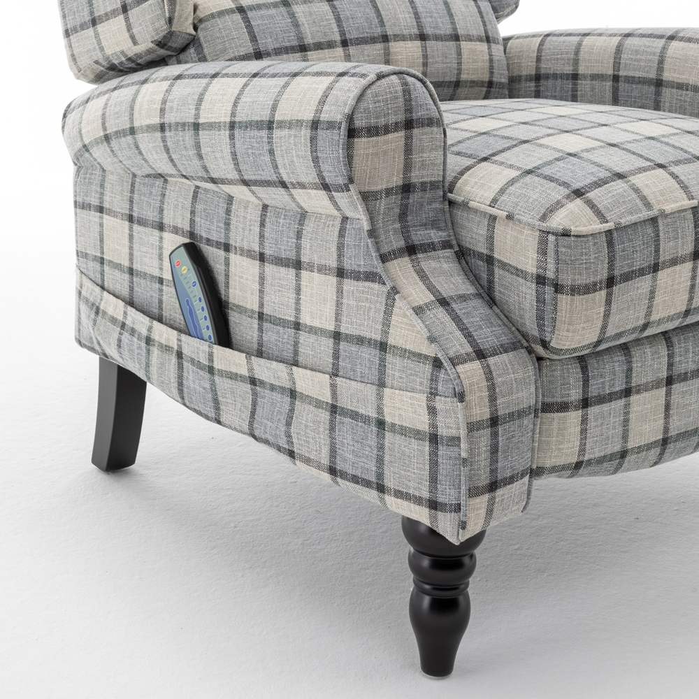 Indulge in the perfect blend of style and comfort with the Furniture One Green Check Fabric Recliner Massage Armchair. This chair is crafted from durable check fabric, ensuring longevity and easy maintenance. The sleek solid wood legs in a black finish and the linear design add a contemporary twist, making it a standout piece in any room. This luxury massage recliner features an upholstered seat and back cushions, providing a soft and supportive space for advanced relaxation. The high back offers ultimate support and comfort, while the chair's design conforms to the ergonomic curve for optimal seating posture.