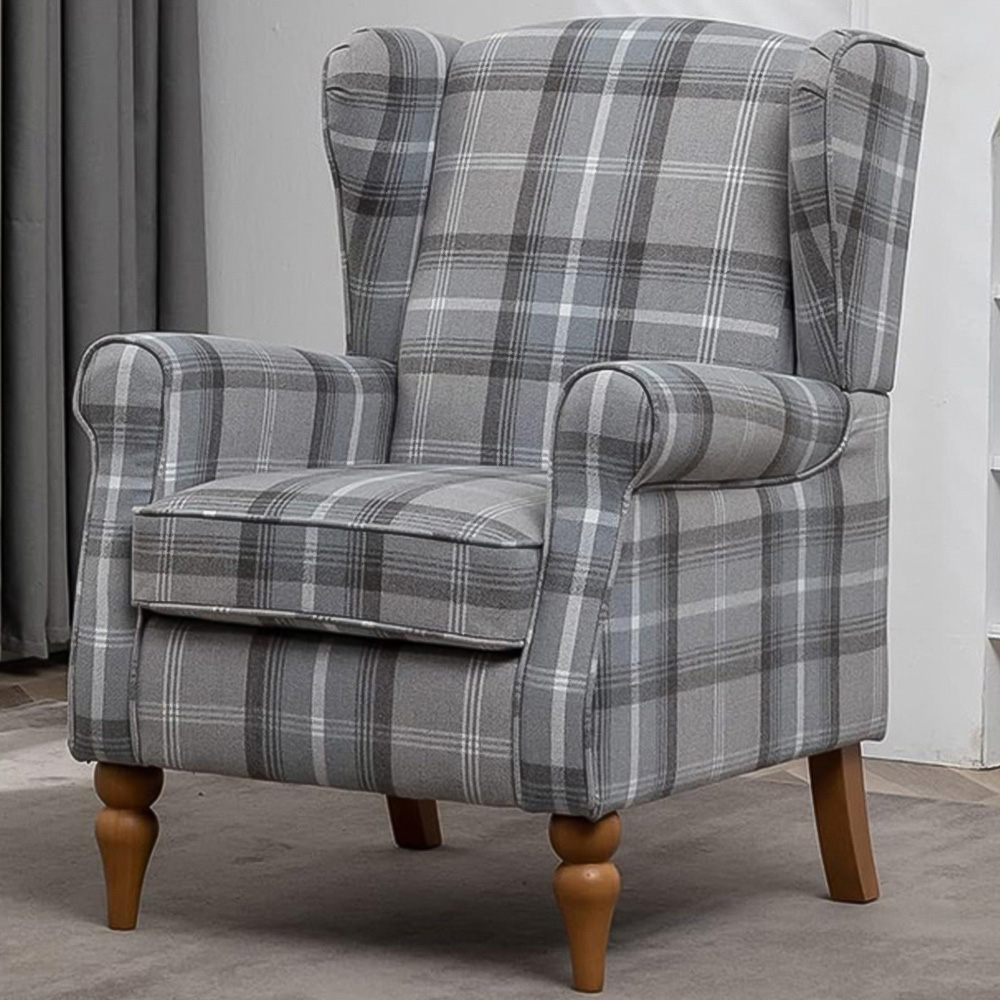 Elevate your living space with the Furniture One Grey Check Fabric Wing Back Fireside Armchair. This chair is designed to be your favourite spot, blending comfort and style effortlessly. Its thick, firm yet soft padding offers ultimate comfort, while the high back design provides excellent spinal support and catches the eye. The armrests add a luxurious touch, perfect for relaxation. Constructed with a solid wood frame and oak legs, this chair is both stable and durable, featuring plastic cushions on the legs to protect your floors. Its versatile design fits seamlessly into any room, whether it’s the living room, office, or bedroom, adding an atmospheric and luxurious touch. Easy to assemble, it includes all necessary hardware and tools, ready for use in just minutes.