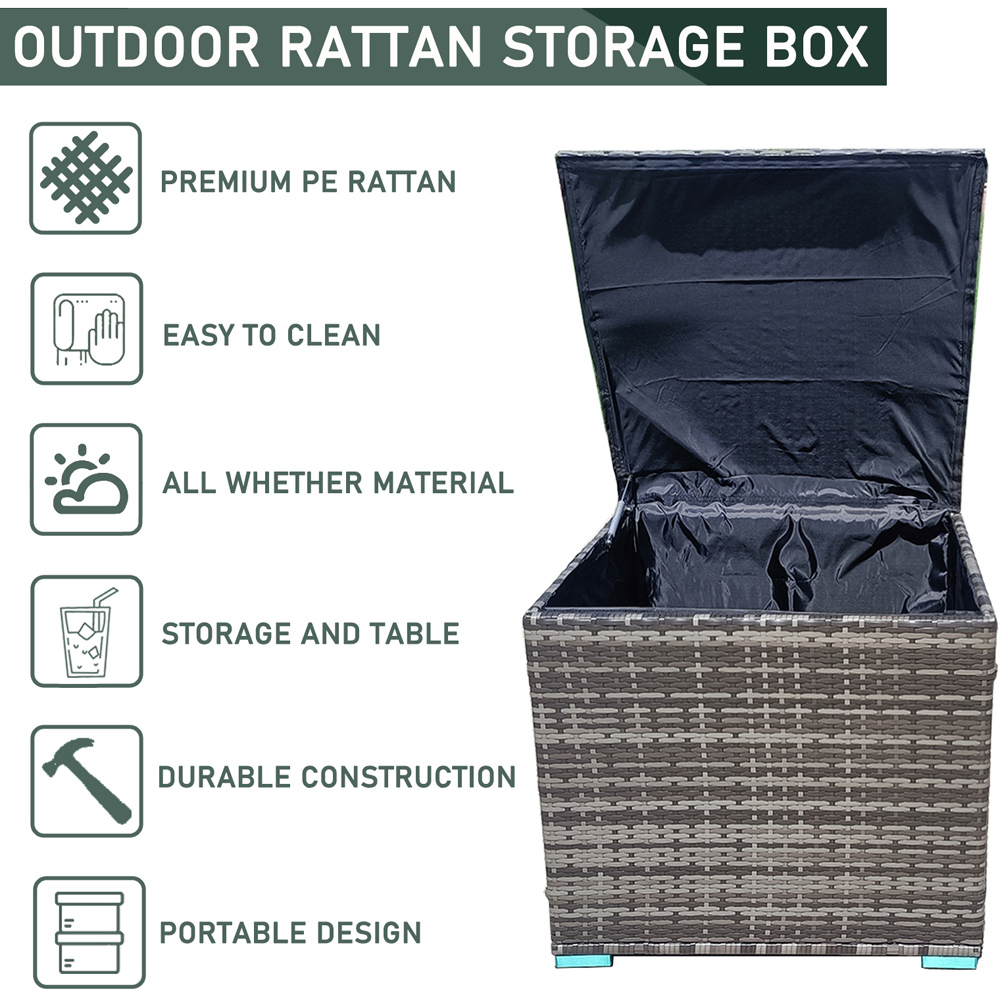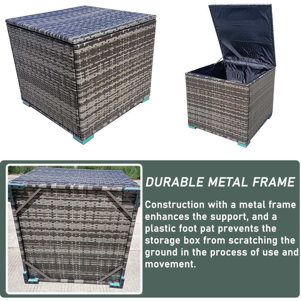 Furniture One 330L deck storage box offers perfect space for your cushions and pillows of the patio set. The 70*70*60CM (L x W x H) inner space is enough for your outdoor storage. All your items inside will be well protected by the polyester liner with PU coated surface. Furthermore, the deck storage box features high stability and durability thanks to the heavy-duty metal frame and hand-woven PE rattan. The pneumatic rod on the one side highly improves safety and saves your effort. Apart from that, the rattan look adds a piece of elegance and fits the patio wicker set well. This storage box can be also used as a functional side table when the lid is closed, bringing much convenience to your outdoor life.