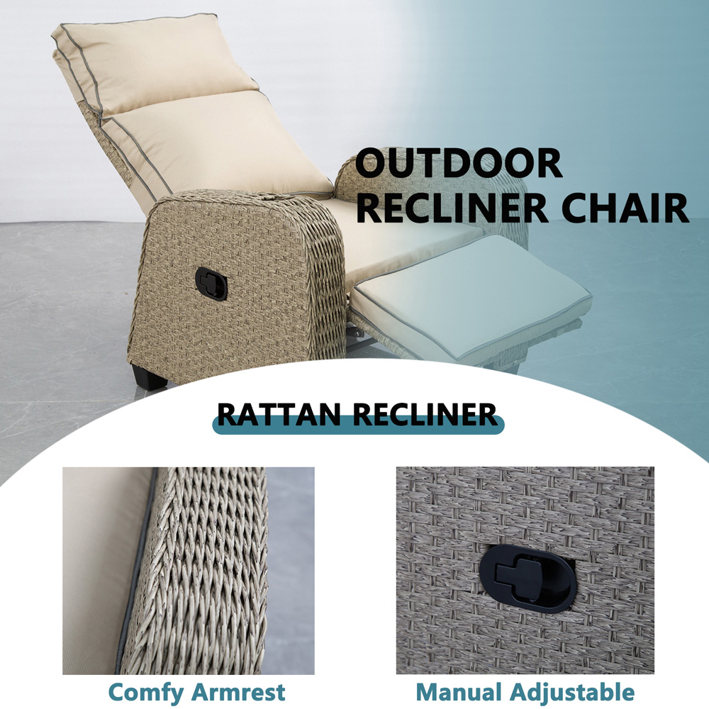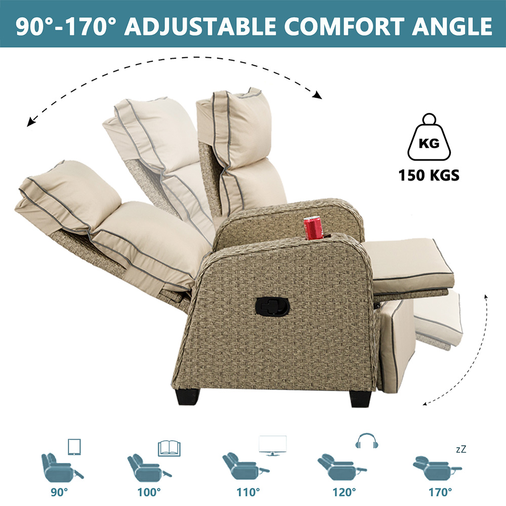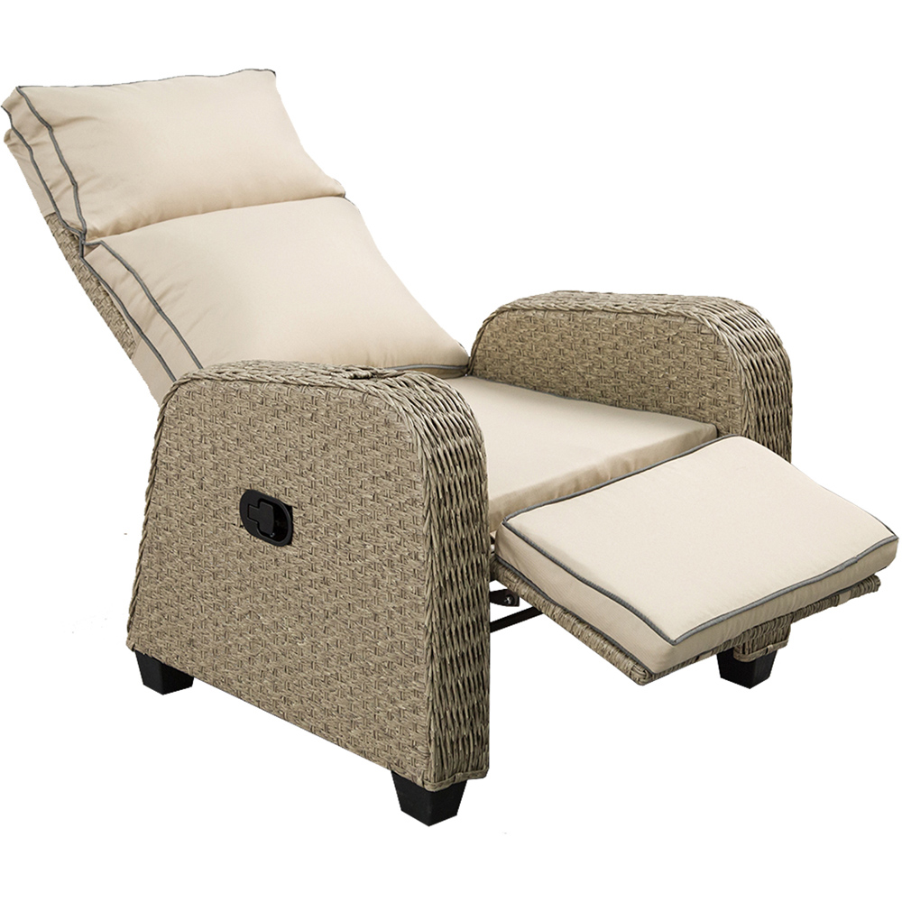A lavish and highly designed recliner for your patio, the FURNITURE ONE Reclining Chair is perfect for lazing back in the sun in pure comfort. Designed with a traditional reclining mechanism, features thick, plush cushions across the back, seat, and footrest, making this chair extremely comfortable to relax in whether you are sitting or lying back. Also features a cupholder which is the perfect place to rest drinks, while you're sunbathing! With light cream cushions and pale brown wicker rattan, the New Hampshire will look absolutely delightful placed in a bright sunspot of your garden, where it will bring a real bright and summery feel. With a frame made from steel, the FURNITURE ONE Reclining chair is also lightweight but sturdy, helping it be your favourite place to lie back and soak up the sun year after year.