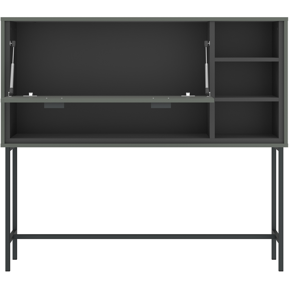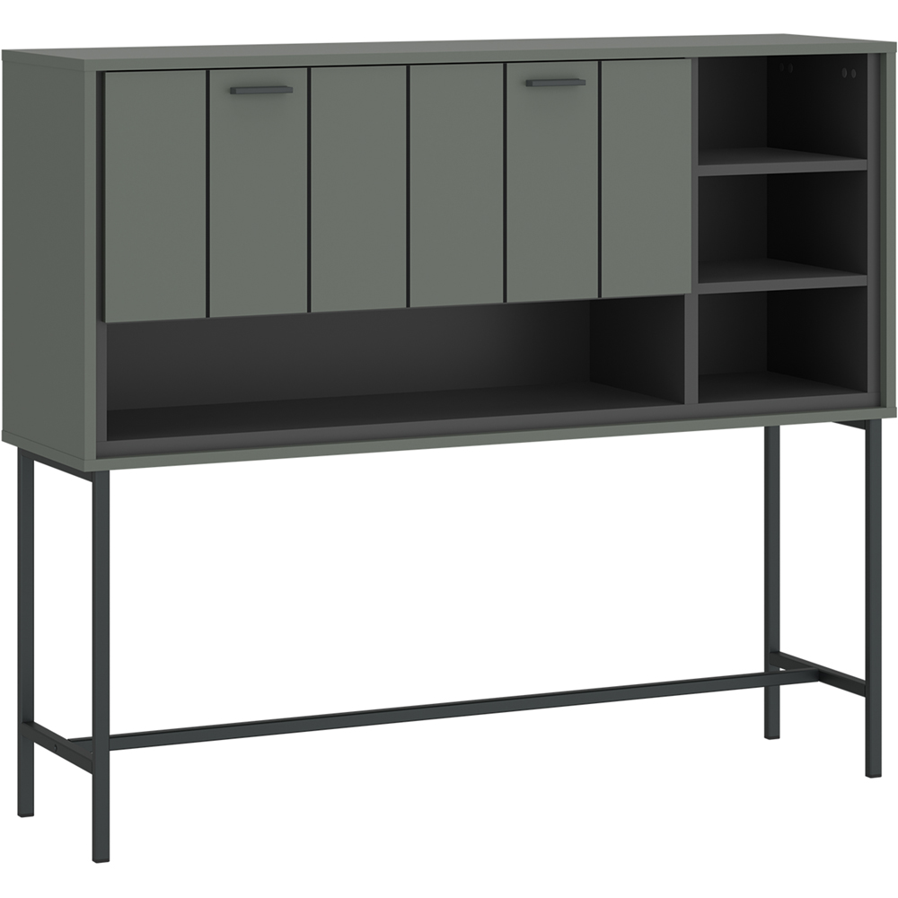 Elevate your space with the Arundel Grey Green Bar Table. Featuring a chic grey-green shade with anthracite accents, it combines a sleek metal base and functional top flap with open shelves. Ideal for modern, industrial, vintage, or eclectic interiors, it adds elegance and versatility to any living or dining room.
