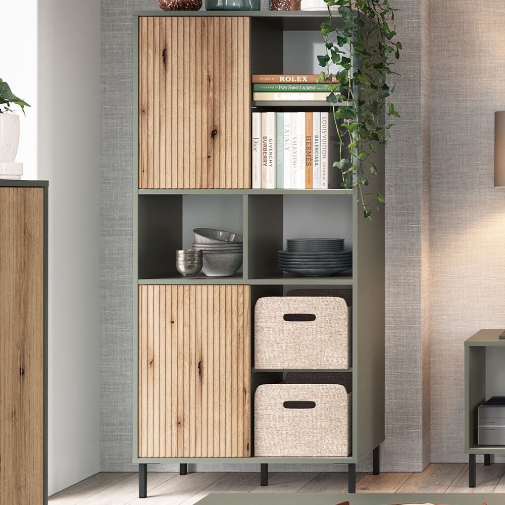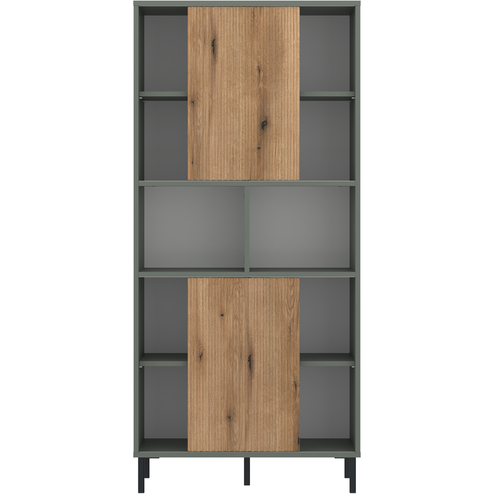 Elevate your space with the Darwin Green and Oak Bookcase. Featuring sliding coast evoke oak doors and a grey-green finish, it blends elegance with functionality. Crafted from laminated chipboard and MDF, this bookcase offers generous storage and a sleek look. High metal legs and sliding doors add modern flair, perfect for displaying or concealing items.