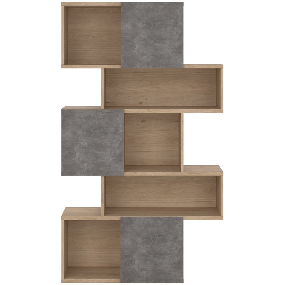 Elevate your living space with this Furniture To Go Maze 3 Door 5 Shelf Jackson Hickory and Concrete Asymmetrical Bookcase. The bookcase's asymmetrical design and two-tone colour palette create a mid-century modern vibe. It features three doors and four shelves designed to offer ample display space for photos, decor, and books. The spacious shelves allow you to curate your unique showcase of cherished memories and decor pieces. This must-have bookcase exudes sophistication and enduring beauty, adding a touch of style to your home decor.