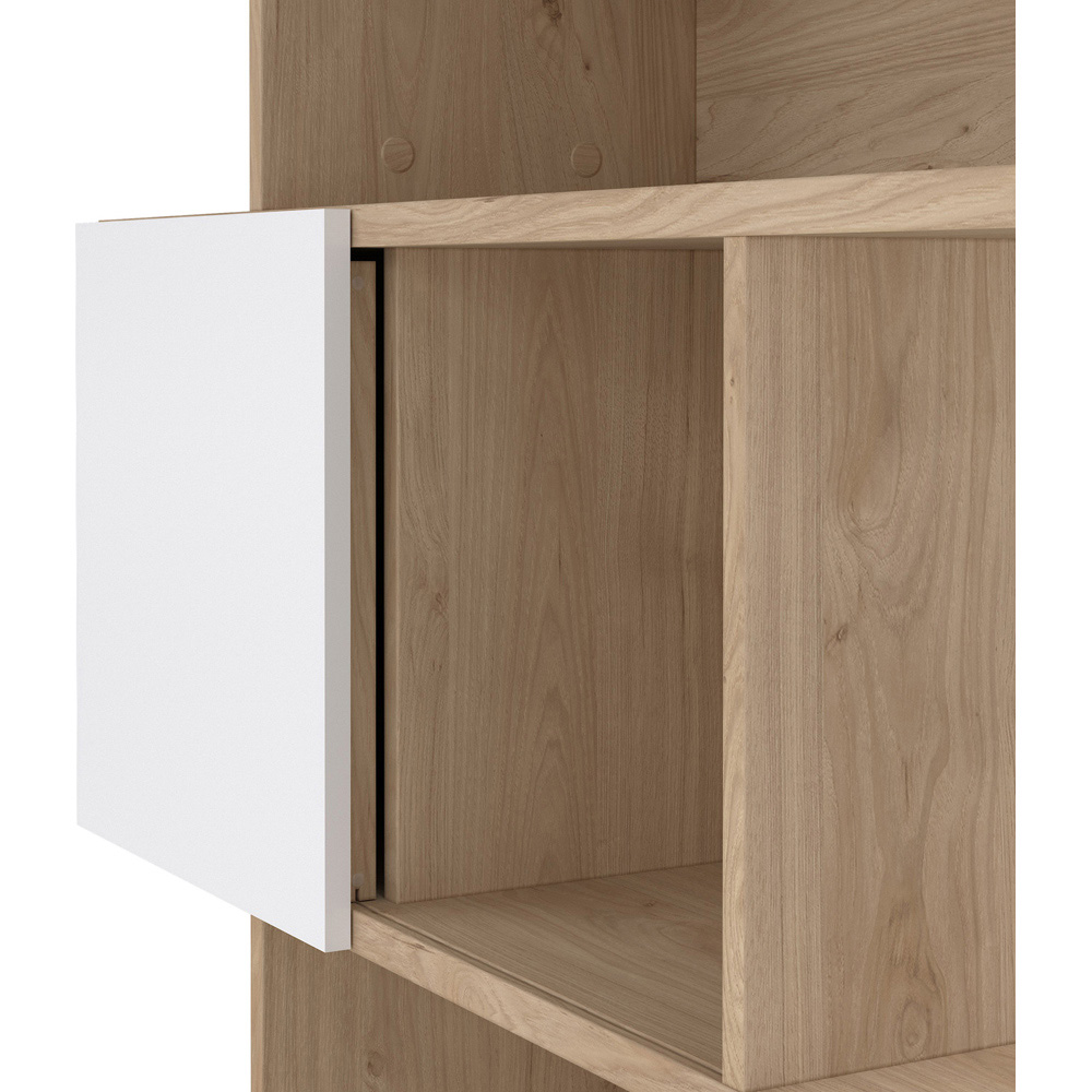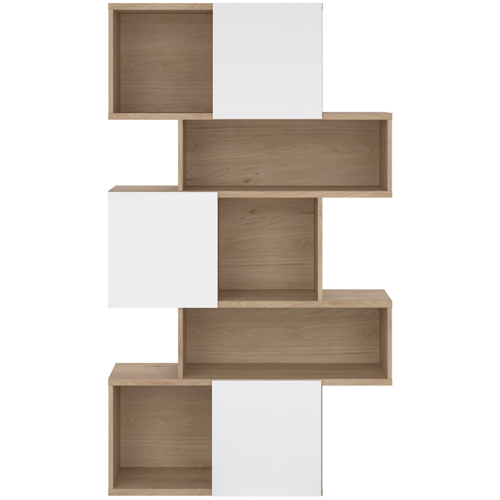 Elevate your living space with this Furniture To Go Maze 3 Door 5 Shelf Jackson Hickory and White High Gloss Asymmetrical Bookcase. The bookcase's asymmetrical design and two-tone colour palette create a mid-century modern vibe. It features three doors and four shelves designed to offer ample display space for photos, decor, and books. The spacious shelves allow you to curate your unique showcase of cherished memories and decor pieces. This must-have bookcase exudes sophistication and enduring beauty, adding a touch of style to your home decor.