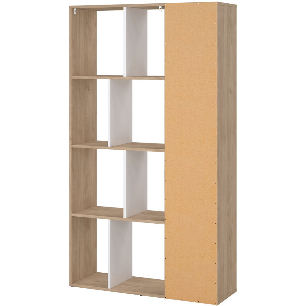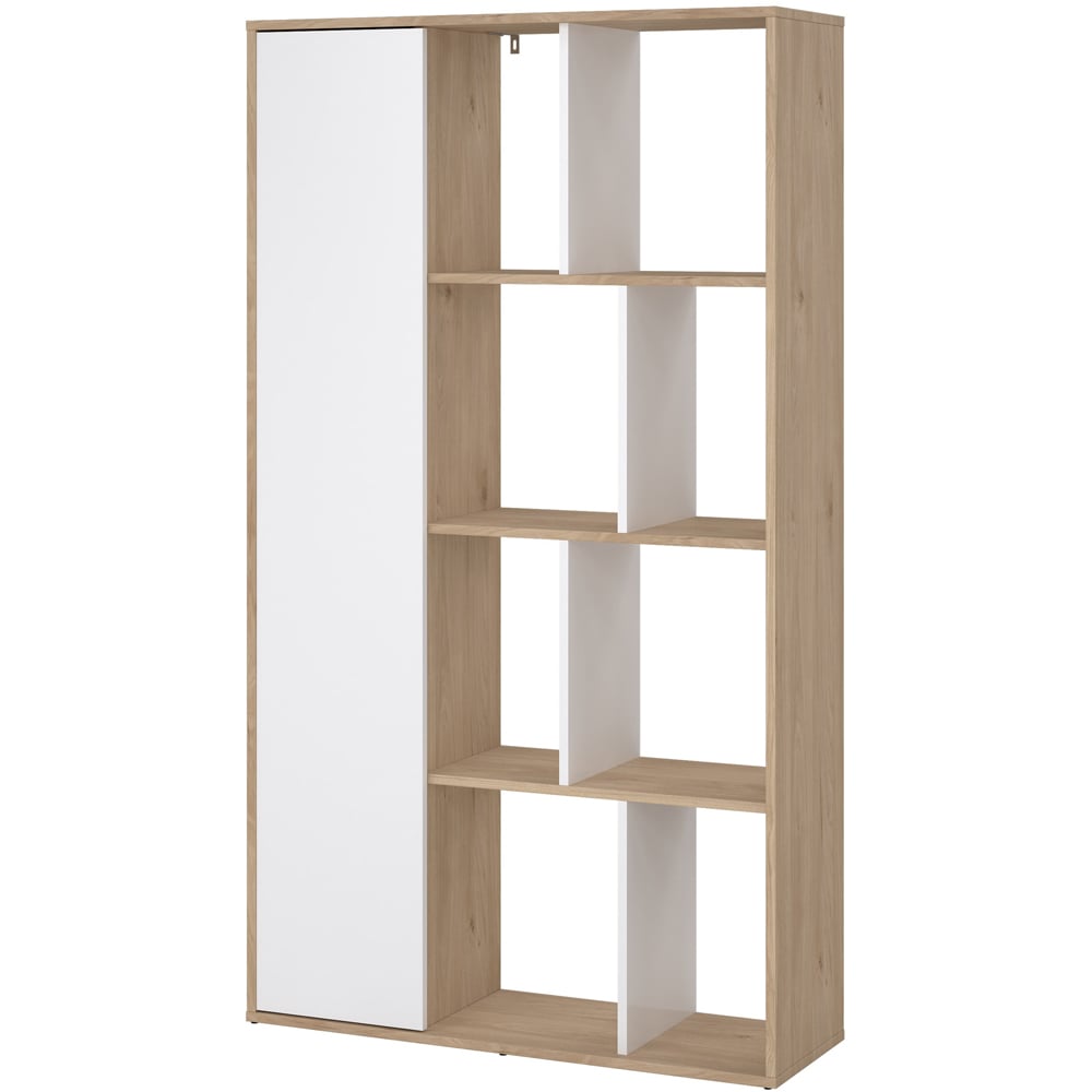 Elevate your living space with this Furniture To Go Maze Single Door Jackson Hickory and White High Gloss Bookcase. The bookcase's asymmetrical design and two-tone colour palette create a mid-century modern vibe. This eight shelf bookcase offers ample display space for photos, decor, and books. The spacious shelves allow you to curate your unique showcase of cherished memories and decor pieces. The open back provides an airy feel to your room. This must-have bookcase exudes sophistication and enduring beauty, adding a touch of style to your home decor.