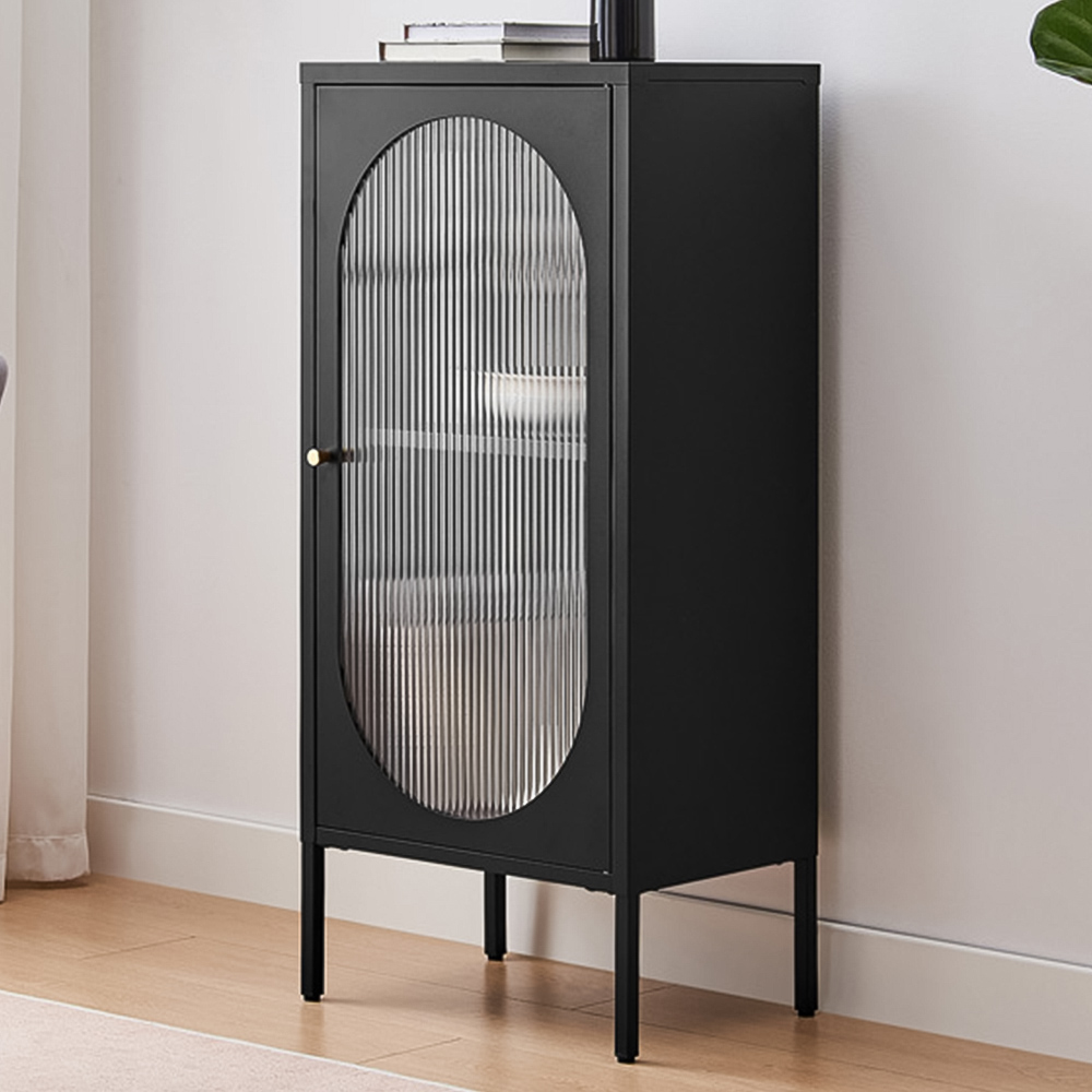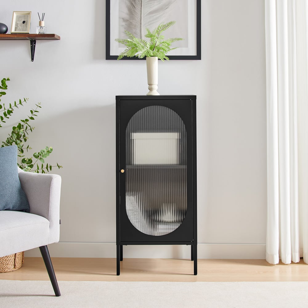 Give a stylish finishing touch to your bedroom decor with this Furniturebox Alba Single Door Black Metal Small Cabinet. Finished with a door and glass panel, it perfectly blends and functions in a stylish modern design that nods to retro industrial art deco styles. The powder-coated bedside table features a hinged door, gold doorknob and arched glass panel with ribbed tempered glass that adds dimension and interest. The flat top gives plenty of space for bedside essentials. Inside, the single shelf allows for greater storage space to keep everything tidy. It makes a lovely contemporary bit of bedroom storage that will suit a range of home styles.