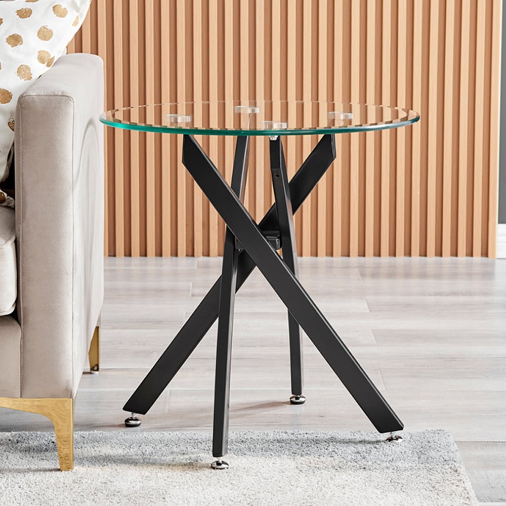 Elevate your home decor with this Furniturebox Arona Black Round Side Table. The design of the legs is industrial but the bright chrome keeps it a minimalist and elegant modern coffee table. Coupled with the clear glass table top, it creates a lovely piece that's functional and will reflect the light to keep your living room bright and airy. The table top is clear tempered safety glass. The legs are chrome metal that is strong and sturdy enough to withstand everyday use without compromising on design. An eye-catching feature without dominating your space.