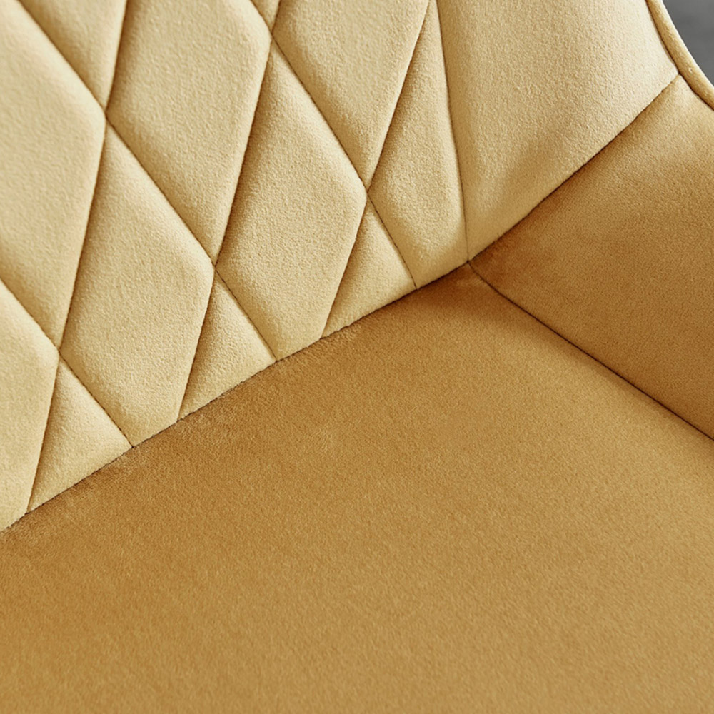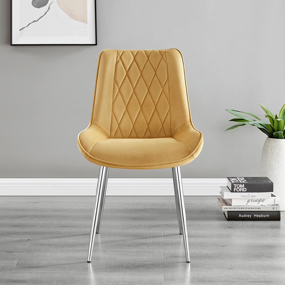 Add an elegant touch to your dining space with this Furniturebox Arona Cesano Marble Effect 6 Seater Dining Set White Chrome and Mustard. It combines a modern white marble effect tabletop with shiny silver chrome legs in an eye-catching nested starburst design. A sleek and minimalist dinner table that will bounce light around your dining area and create a sense of space. At 120cm across, this table will comfortably seat up to six, with round tables also great for more intimate, relaxed dining and smaller spaces. Modernise your dining area with the luxurious velvet upholstered Cesano Dining Chairs. With a nod to the Mid-century modern design era, the Cesano features gorgeous textured diamond stitching with an ergonomically designed curved seat pad blending seamlessly with the supporting medium-high backrest. Sat atop elegant, slightly tapered legs in black, chrome or gold effect. The Cesano is a perfect match for any dining table or use as a luxe vanity seat in the bedroom, as an occasional chair for the living area, or to add a bit of luxury to your home office.