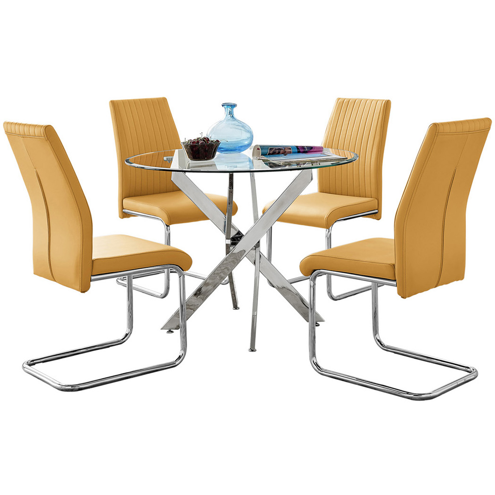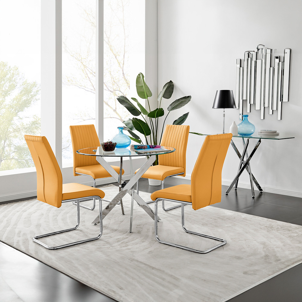 Design your dining dreams with this Furniturebox Arona Fontana 4 Seater Round Dining Set Mustard Yellow and Chrome. The 100cm dining table features a stylish and modern combination of chrome and glass, making the set a real eye-catcher. Its chrome legs provide plenty of support to the table, and the glass top, made from 10mm strong, clear tempered glass, is easy to maintain. This dining set is tied off nicely by four high-quality faux leather chrome dining chairs with deep foam cushion seats, which are ergonomically designed for maximum comfort.