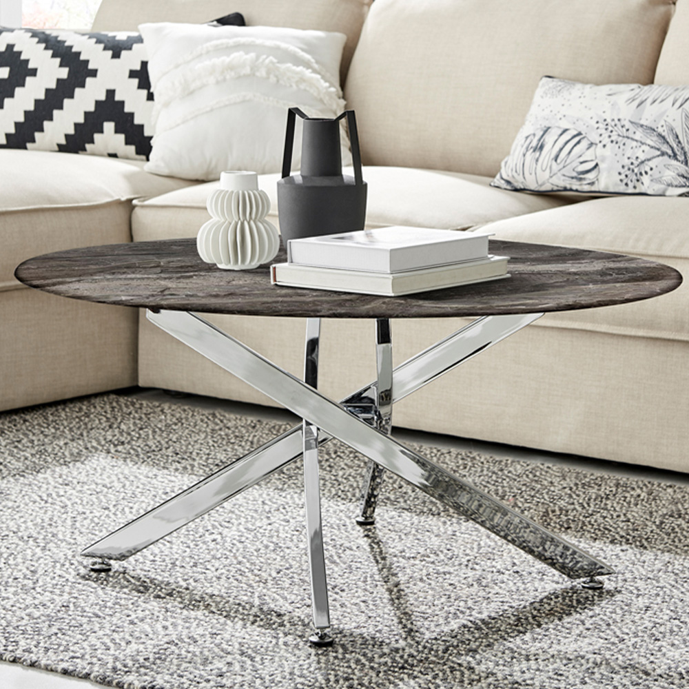 Elevate your living space ambience with this Furniturebox Arona Round Marble Effect Glass Coffee Table with Silver Legs. The round table top is crafted from strong tempered glass with a smooth rounded edge. It's designed with a stylish marble effect table top to add a focal point without overwhelming your space. It sits on top of beautiful, sturdy silver legs in a stylish nested starburst design. A perfect blend of minimalist design with a contemporary style, this table will transform your living room or hallway instantly. Note: This tabletop is meant to imitate real natural marble. It has a warm natural stone colour that can look more grey, beige or brown depending on the room and lighting in which it's placed. The pattern and exact colour of each piece may vary to reflect the variations in natural marble. The piece you receive may not be identical to the piece photographed.
