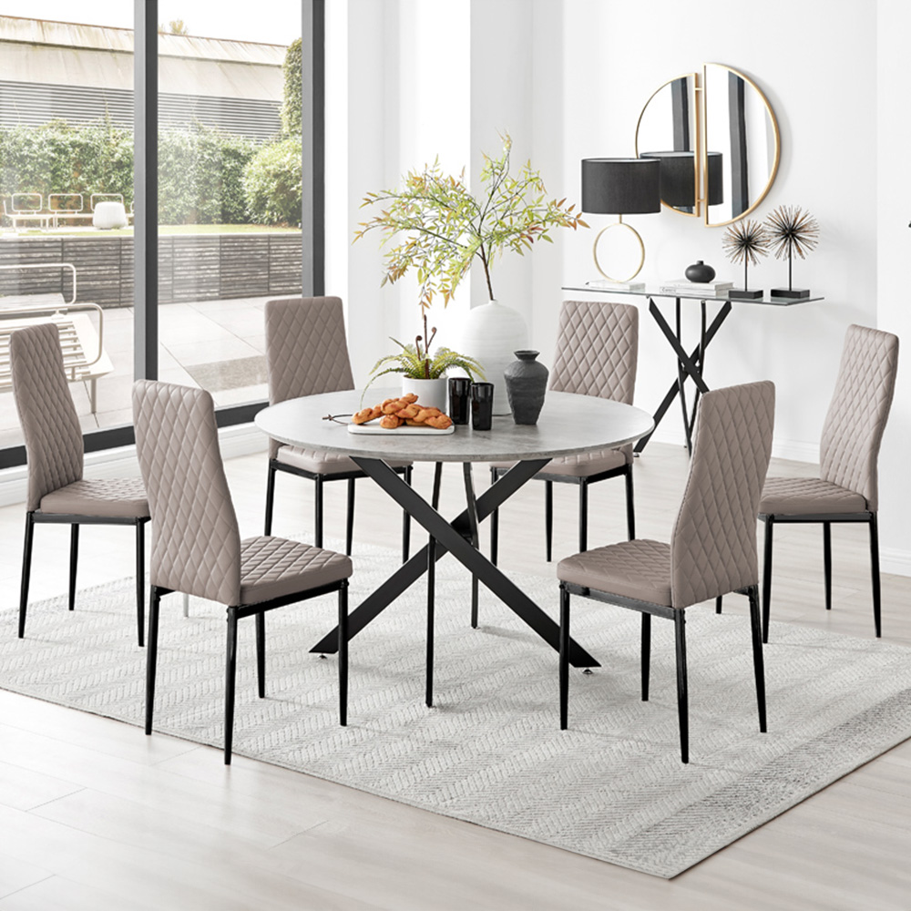 Transform your dining space with Furniturebox Arona Valera Concrete Effect 6 Seater Round Dining Set Grey and Cappuccino. This unique and contemporary design combines a modern concrete effect tabletop with chic matte black metal legs in an eye-catching nested starburst design. The open space created by the legs gives the table a light and airy feel, while the strong metal legs make it sturdy and a central feature of the room. Measuring 120cm across, the table comfortably seats up to six people, making it perfect for intimate and relaxed dining. The grey concrete effect veneer is on-trend and easy to clean, ensuring that your table will stay looking great for years to come. The dining chairs are upholstered in soft faux leather and finished with diamond pattern stitching. The thick seat cushion and ergonomic design ensure maximum comfort and support, while the tightly stitched seat and back guarantee longevity even with regular use. The sleek black finish of the chair legs offers a strong base for the chairs, which can withstand loads of up to 130kg. Additionally, plastic feet protect your flooring without compromising on style. This set is perfect for those who want a modern and chic dining space without compromising on comfort and practicality.