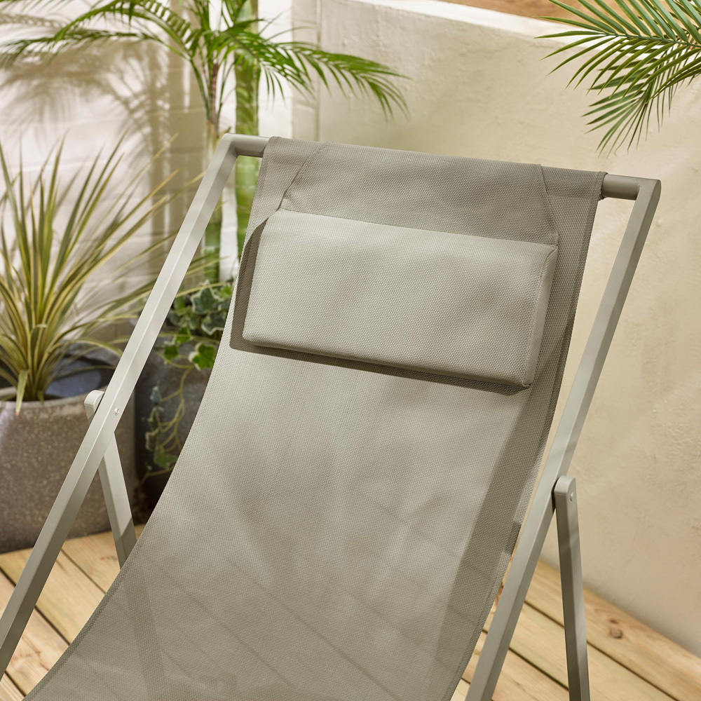 The pair of Corsica metal and textilene pale green outdoor deckchairs will add a lovely little pop of colour to your garden deck, patio or (if you are lucky enough) pool side. A really simple shape with vintage retro design nods, we love how sweet these look. Includes built-in foam headrest pillow, and stands on four angled legs. These deck chairs can be folded flat for easy storage. Constructed from a sturdy green powder coated steel frame with non-slip plastic feet, and textilene seat - a durable, UV and weather resistant high-performance synthetic material designed to last without fading. Comes fully assembled. Also available in pink and cream, and we also sell matching outdoor sun loungers too, so check out the full Corsica range today.