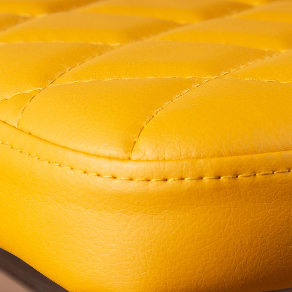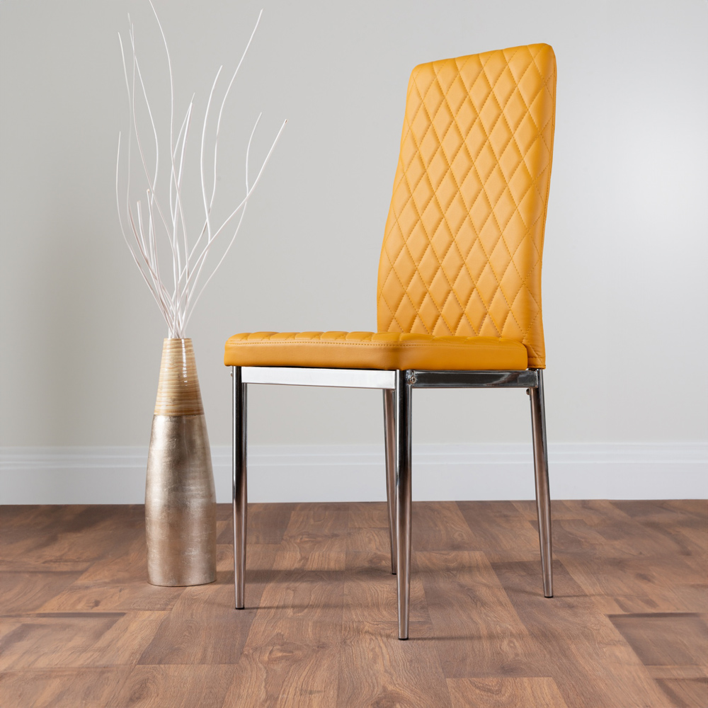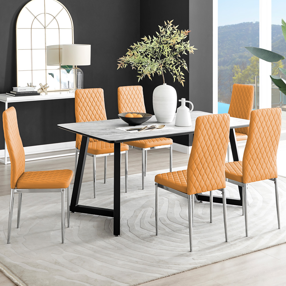 Upgrade your dining space in style with Furniturebox Copeland Valera Marble Effect 6 Seater Dining Set White Mustard and Chrome. Its 90 x 160cm melamine tabletop features are trendy, scratch resistant marble veneer, perfect for full family dinners and entertaining guests. The table sits on striking powder-coated U-shaped legs with angular indents, creating a sleek, minimalist industrial vibe. This beautifully designed table sets the sign for a stylish and opulent room. Complete the look with stylish dining chairs for ultimate comfort the dining chairs combine contemporary style with practical everyday usage. Featuring curved Chrome legs and high-quality faux leather, these chairs are economically designed with deep foam seat cushions for maximum comfort and support. Plastic feet protect your floors, making the chairs a classy and practical addition to your dining room at an unbeatable price.