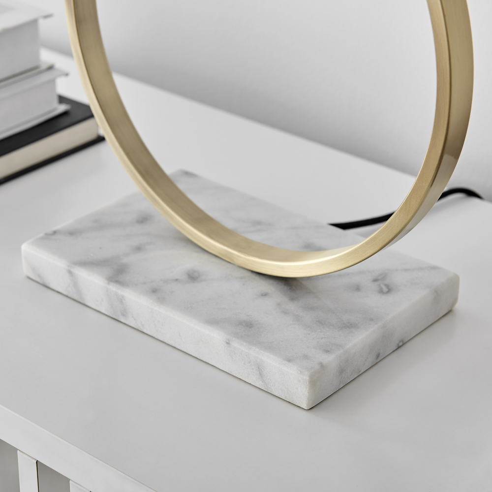 The Crocus table lamp from Furniturebox is structural yet simple and eye-catching yet minimalist. Featuring a marble base and gold metal stand with "halo" design, topped with a black fabric lampshade that has an elegant and luxurious weave to it. A gorgeous combination of materials and colours that creates contrast. This table lamp would look stunning in any modern home, from maximalist to minimalist, glam to industrial. The gold halo is striking but also keeps the design feeling light and airy, so it won't overwhelm your space. Perfect for any desk, table or console. Stands 38cm tall, with a black corded cable and rocker switch. Requires one 60W E27 bulb, which is included. Please click here to find our range of lightbulbs.