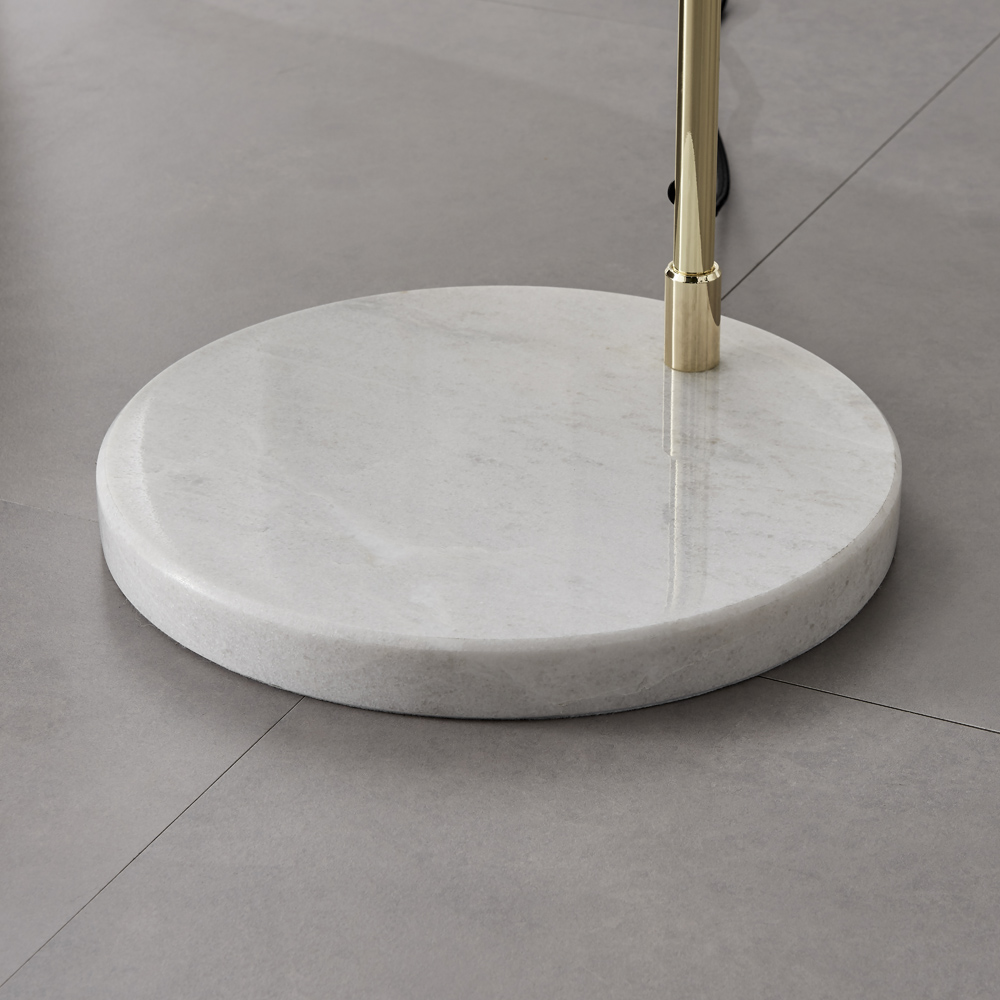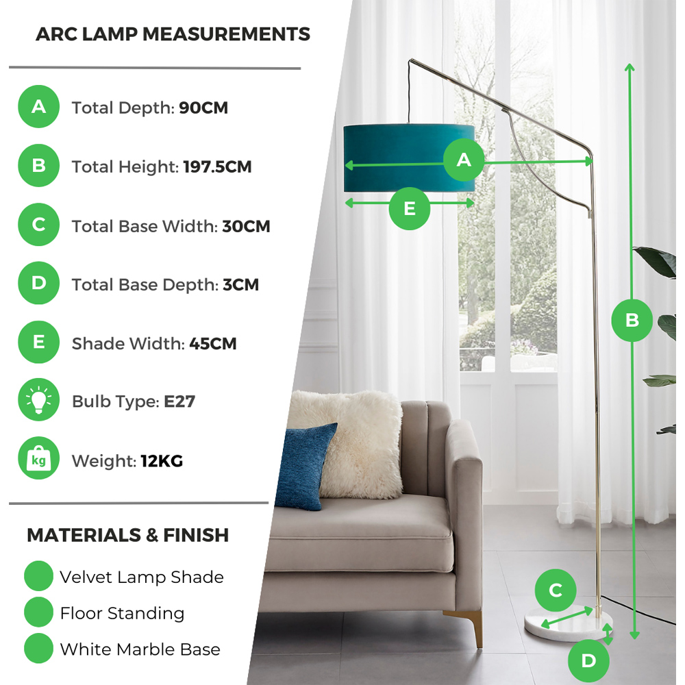 Brighten your world in vintage style with this Furniturebox Dorothy Teal Floor Lamp. Featuring a solid white marble base with grey veining and a brass angled 'arc' arm, topped with a teal velvet fabric lampshade, it is the perfect standing lamp for your living room, bedroom or even office. It is a modern glam take on more retro vintage styles, with nods to 1920s art deco design but still in keeping with contemporary minimalist trends. Includes a black corded cable and foot-button switch. Requires one 28W E27 bulb (not included).