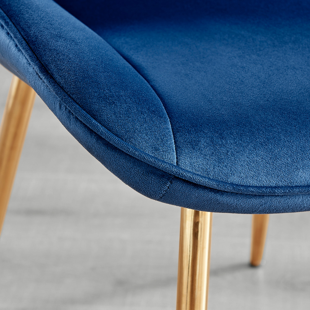 Enhance your kitchen decor with the Furniturebox Elissa Cesano Marble Effect 2 Seater Round Dining Set White Navy and Gold. The 80cm round dining table features a marble-effect tabletop with a black powder-coated metal pedestal base. The sleek table is suitable for most interior spaces while the open space around the pedestal makes it ideal for relaxed dining. This set includes two navy chairs upholstered using soft velvet with cosy padded seats for ultimate comfort. The Cesano dining chairs have ergonomically designed curved seats with diamond pattern stitching and tapered gold-effect legs for stable support. This dining set has a soothing design that will effortlessly blend with all types of interior spaces.