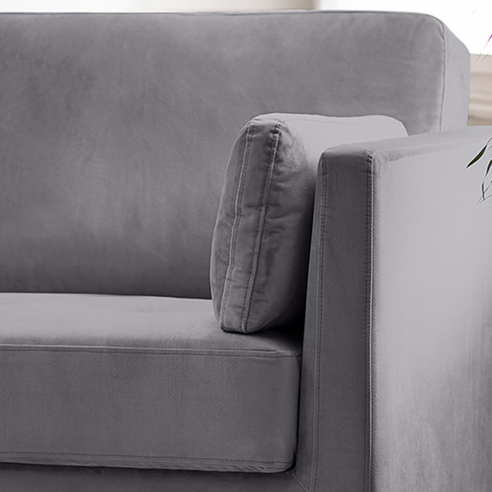 Experience luxury and comfort with Furniturebox Eva Single Grey Velvet Arm Chair. This sofa sits on thin cylindrical black metal legs and features a simple design with straight lines, rounded edges, and slim cushions. It captures minimalist and industrial vibes while fitting various interior styles. Upholstered in soft touch velvet for optimum comfort, it's both stylish and versatile.