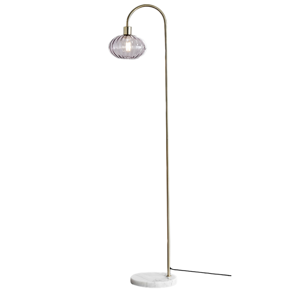 Illuminate your space with an elegant Furniturebox Evelyn Smoked Glass and White Floor Lamp. This lamp features a sleek modern take on more vintage retro lighting designs. Perfect for bedrooms, living rooms or anywhere that just needs a little extra sparkle. A standing lamp that is streamlined, with a brushed brass arched stand, solid white marble base with grey veining and a gorgeous smoky glass bowl shade. The shade has subtle ribbing that will diffuse the light beautifully and is a nod to that 1920s art deco Industrial vibe. The simple shape keeps it up-to-date. The Evelyn will look stunning in a range of home styles, from maximalist to minimalist, glam to industrial. With a black corded cable and foot-button switch. This product requires one 28W E27 bulb (not included). Please click here to find our range of lightbulbs.
