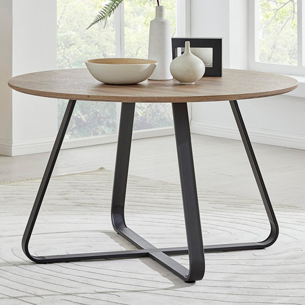 Add warmth and style to your dining space with this Furniturebox Fira 4 Seater Wood Effect Round Dining Table. With a contemporary twist on a modern classic, this Bauhaus-inspired wood effect and metal table features a striking curved cross-leg design topped by a smooth wood-effect surface. At 120cm in diameter, it will seat four people with ease, and the combination of materials adds texture and colour to the design. Dress it up with modern chairs for a contemporary look suitable for any home.