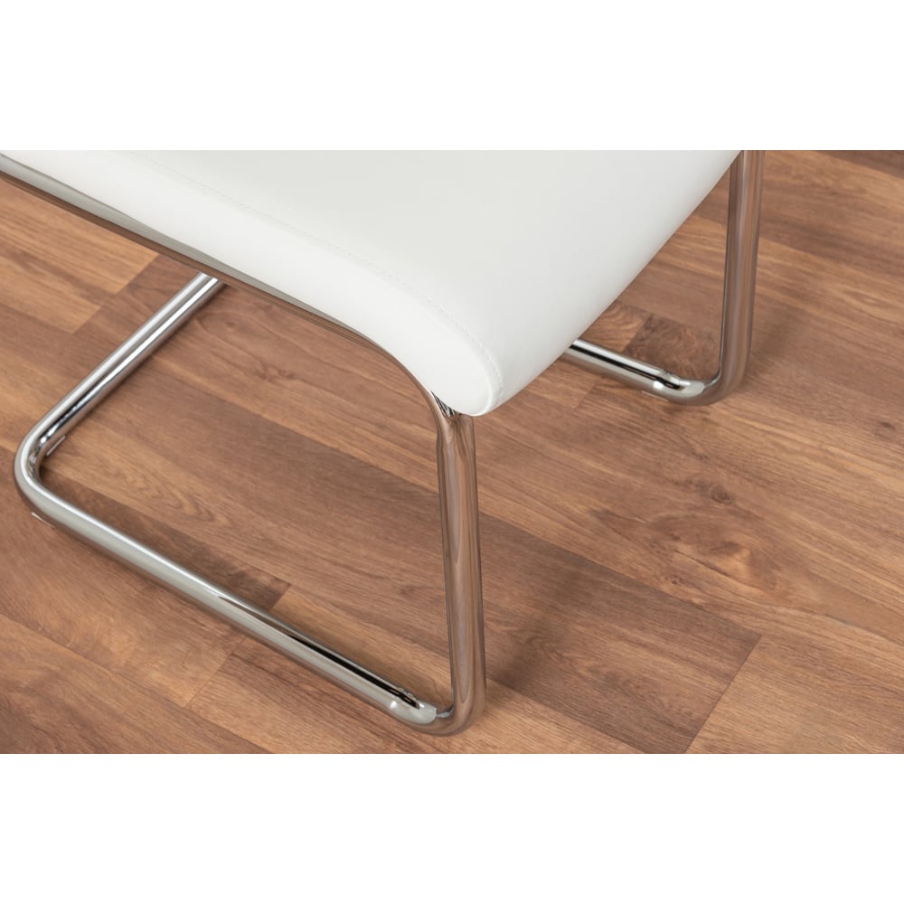 The Fontana Dining Chairs from Furniturebox feature stylish curved chrome legs and stitched leather combinations to give a contemporary edge, whilst their simple design allows for practical everyday usage. Set of two, the chairs are made from high-quality, soft-touch faux leather in white and are ergonomically designed for maximum comfort and support. Featuring deep foam seat cushions, these chairs are a delight to sit on and the plastic foot pads protect the floor from any damage! At a truly unbeatable pair of chairs to add some class to your dining room!