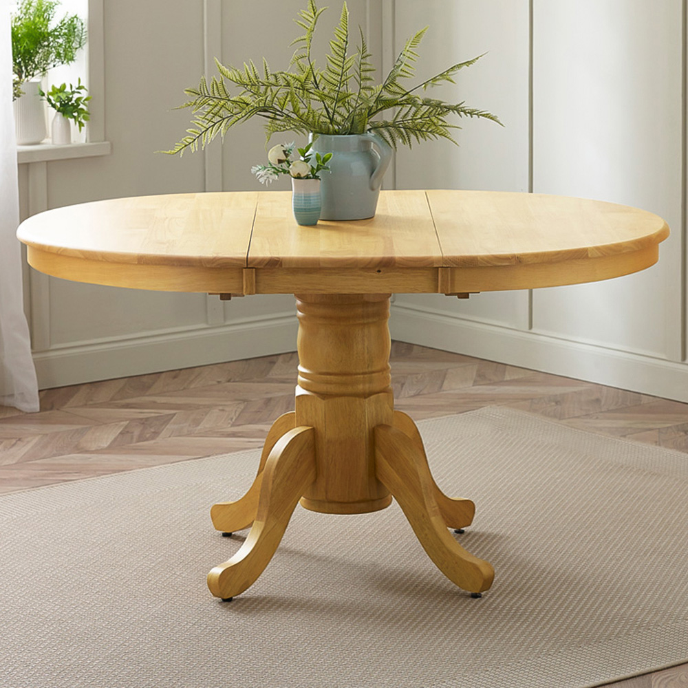 This Fowey round wooden extending dining table with pedestal leg with oak effect stain is all about that chic rustic farmhouse style. This table will comfortably seat 4 when closed and 6 when extended. With clean lines, sturdy design, rounded edges to the table top and sitting on four feet jutting from that central pedestal leg, this table will look fab in any modern home, whether you're going for warm neutrals, that French elegant cottage look or even as part of an eclectic maximalist space. Constructed from solid 100% rubberwood with a warm oak-coloured stain, this extendable dinner table is sturdy, durable and will look great while doing it! The Fowey uses a simple butterfly mechanism - gently pull on either end of the table to 'open' the sliding mechanism and reveal the extension piece concealed under the top. Lift and unfold the extension piece to create the additional length.